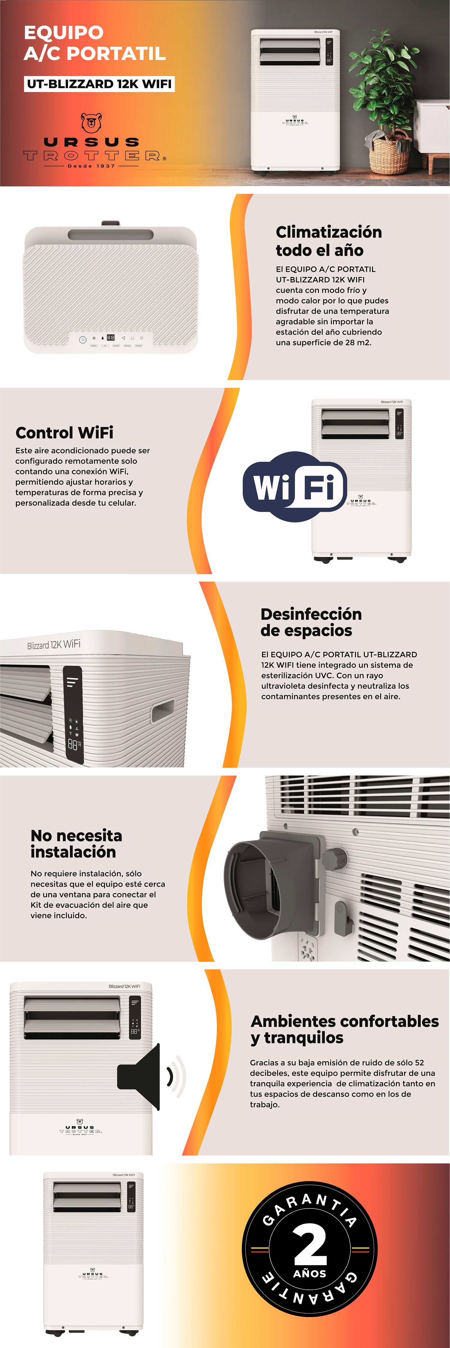 Aire acondicionado de 12000 BTU. Equipo con función frío/calor. Display frontal integrado. 3 niveles para velocidad de ventilador. Funciones: Ventilador, Deshumidificación, Abanico y Quiet. Control vía smartphone WiFi. Programador de encendido 24 horas.