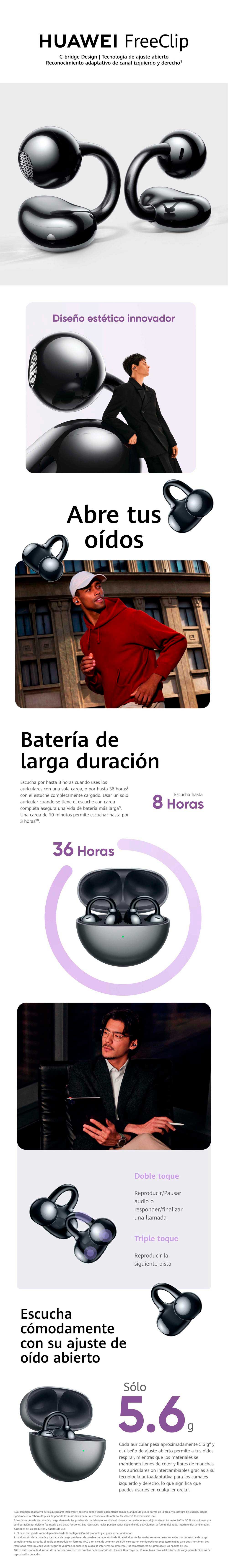 Reproducción de música: Hasta 8 horas después de una carga completa y hasta 36 horas cuando se usa con el estuche de carga.