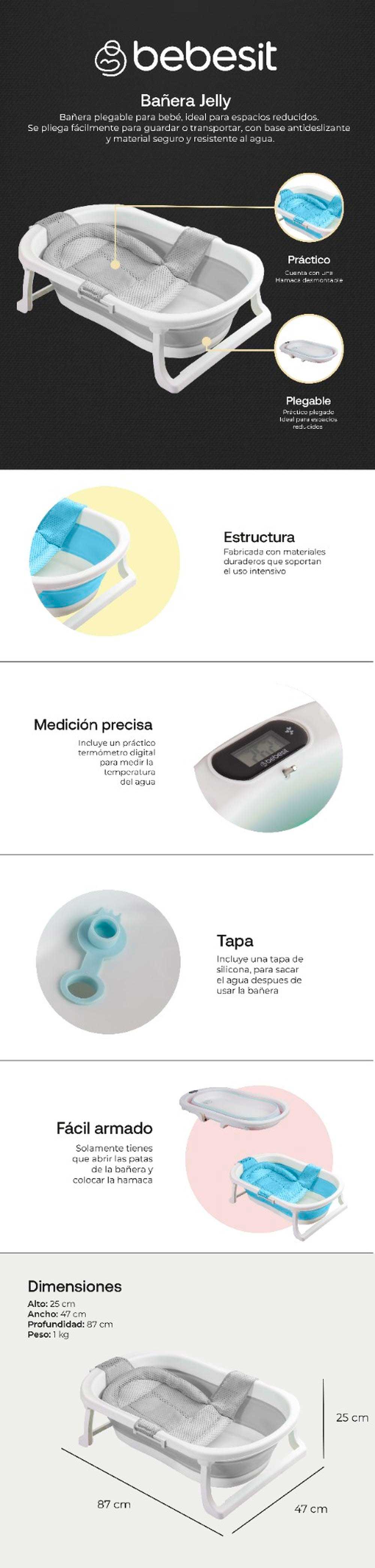 Plegado compacto extra delgado,Cuenta con malla para mayor seguridad,Sistema tipo acordeon material suave al tacto,Termometro digital para medir temperatura del agua,Para mayor confort adecuada para espacios pequeños,Ademas puede usarse como moises de forma independiente ,Soportes antideslizantes Secado Rapido Paredes plegables de Goma,No exceda el imite de 30 litros de agua en la bañera,Recomendado para niños recien nacidos maximo 3 años