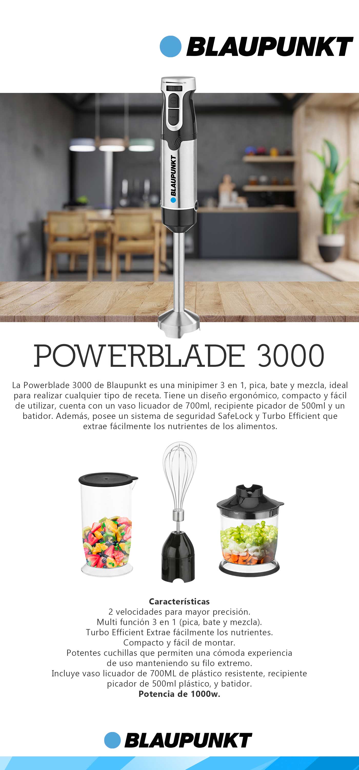 El Powerblade-3000 de Blaupunkt es una mini pimer, multifunción 3 en 1, tritura, licua y exprime, cuenta con un potente motor de 1000W, velocidad variable para mayor precisión, potentes cuchillas de acero inoxidable que permiten una cómoda experiencia de uso manteniendo su filo extremo.Cuenta con un vaso licuador de 700ml, un vaso picador de 500ml y un batidor