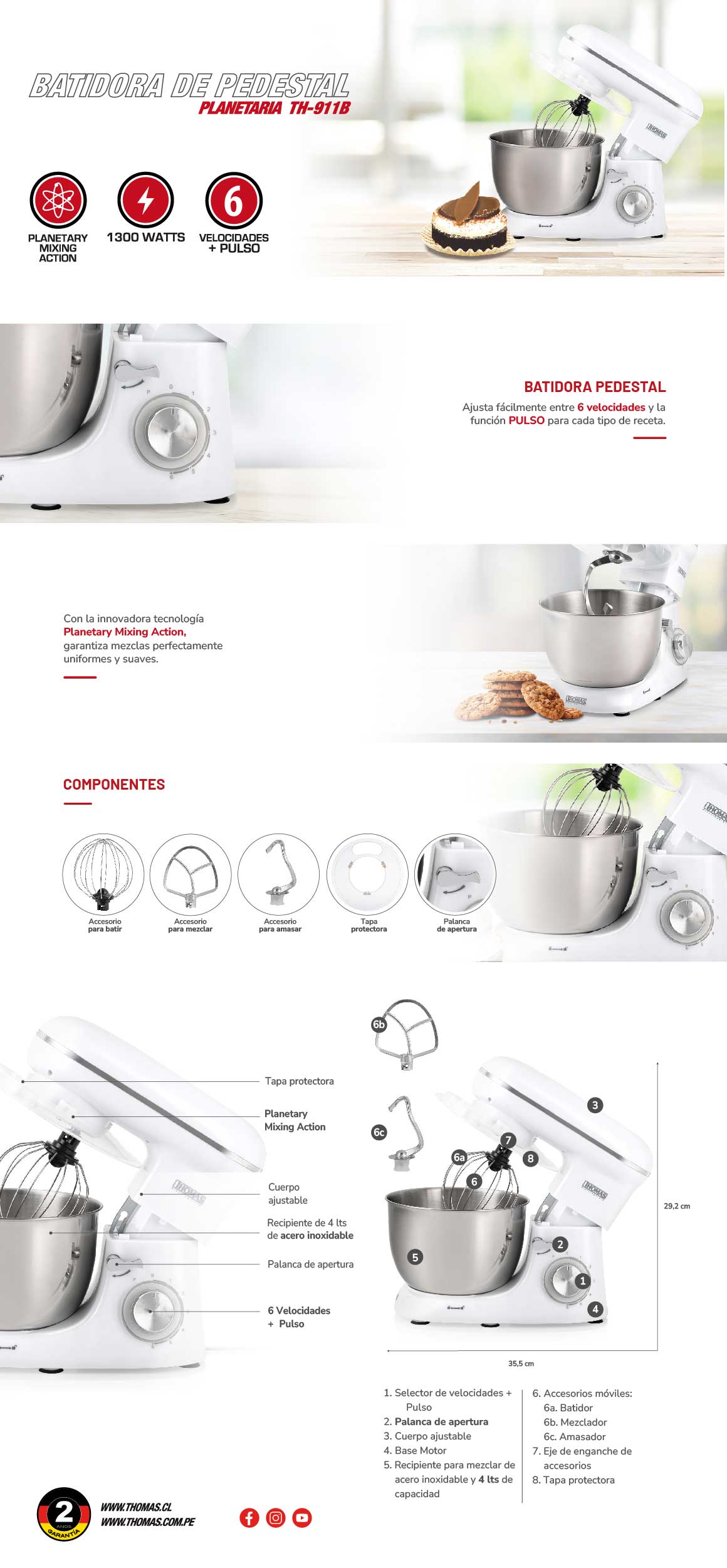 Potencia 1300 Watts, Tapa para bowl con ventana, accesorio para batir, mezclar, amasar, 6 velocidades mas pulso, Bowl de acero inoxidable de 4,5 litros, Palanca de apertura