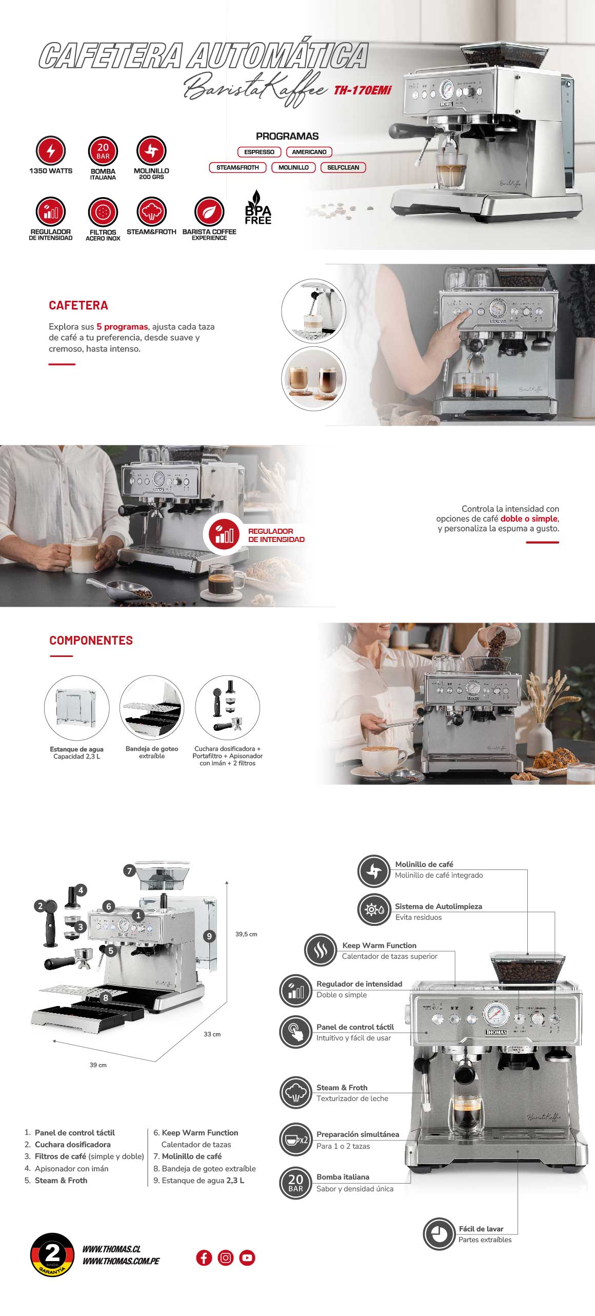 Potencia 1350 WattsCapacidad estanque de agua 2,3 L20 BAR Bomba ItalianaMolinillo de café 200 grs.Steam&Froth. Texturizador de leche.Cuchara dosificadora + Portafiltro + Apisonador con imán + 2 filtros (simple y doble)Preparación simultánea. Para 1 o 2 tazas.Keep Warm Function. Calentador de tazas. Panel de control táctil.Sistema de AutolimpiezaFiltros de acero inxidableRegulador de intensidad. Doble o simple.BPA FREEBandeja de goteo extraíbleIncluye porta filtro compatible con Nespresso ®Máquina compatible con cápsula Nespresso ®, Nespresso ® compatible y cápsula E.S.E 44mm