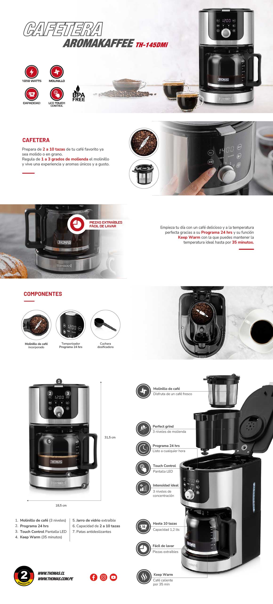 Potencia 1050 WattsCapacidad de 2 a 10 tazasMolinillo de café (3 niveles)Touch Control Pantalla LEDKeep Warm (35 minutos)Programa 24 hrsJarro de vidrio extraíbleBPA FREEPatas antideslizantes