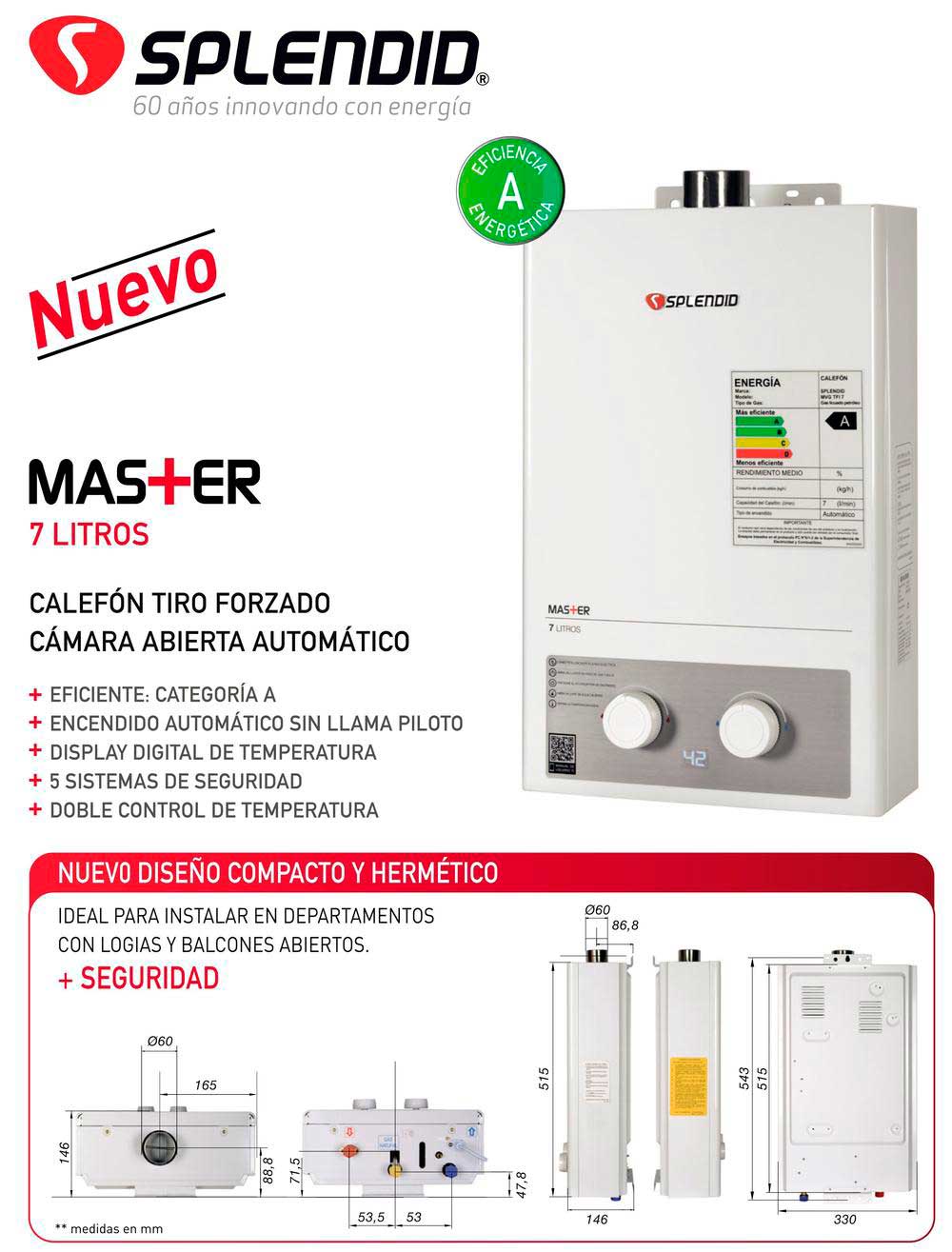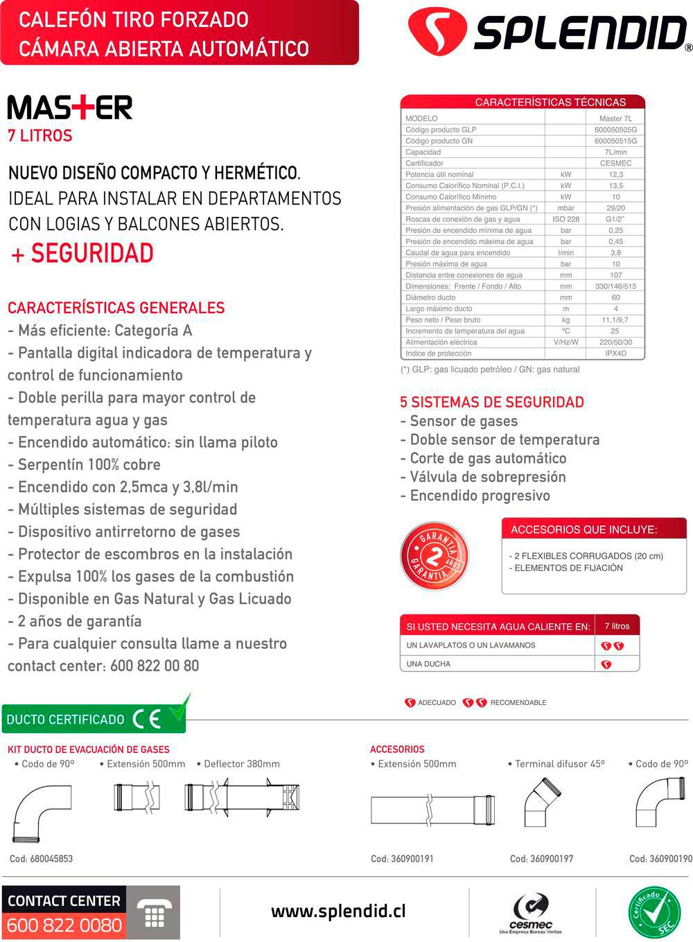 Calefont ionizado Splendid de Tiro Forzado con mayor eficiencia y ahorro de gas, doble control de temperatura y encendido automático sin llama piloto. Seguridad con 70 años de respaldo.Múltiples sistemas de seguridadTodos los calefones Splendid cuentan sistemas de seguridad que garantizan el correcto funcionamiento de nuestros equipos y el bienestar tu familia. Sensores que evitan que tu hogar esté expuesto a gases peligrosos o a sobrecalientameinto del agua; válvulas que controla la presión del gas y doble sello en la conexiones. Al abrir la llave de agua caliente, el calefont Splendid se enciende automáticamente gracias a su sistema ionizado. Entregará agua caliente a duchas, lavamanos o lavaplatos en tu hogar sin necesidad de fósforos ni chisperos.¿Cómo escoger un calefont?Antes de comprar, verifica el tipo de gas que usa tu hogar. Puede ser gas natural por cañería o gas licuado en cilindros. Atención: algunas instalaciones de cañería pueden ser de gas licuado, te recomendamos consultar tu boleta de servicio de gas. ¿Cuántas duchas, lavamanos y lavaplatos tienes en casa? La capacidad del calefont dependerá de la cantidad de agua caliente que requieras en casa.70 años de respaldoConfía en la seguridad y el respaldo de los 70 años de Splendid, contamos con servicio técnico a lo largo de Chile. Recuerda que, para hacer válida la garantía, la instalación y manipulación de este producto debe ser realizada por profesionales certificados por la SEC.