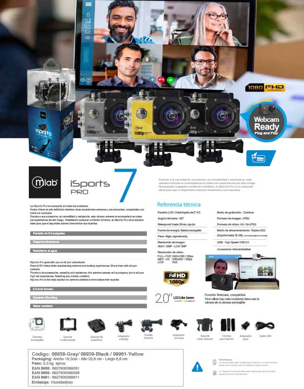 Carcasa Sumergible, Soporte MultiProposito, Soporte de Superficie, Adaptador Multiple, Anclaje, Adaptador bicicleta, Soporte Modo Welcam, Correas para Fijacion, Adaptador Base y Cable USB