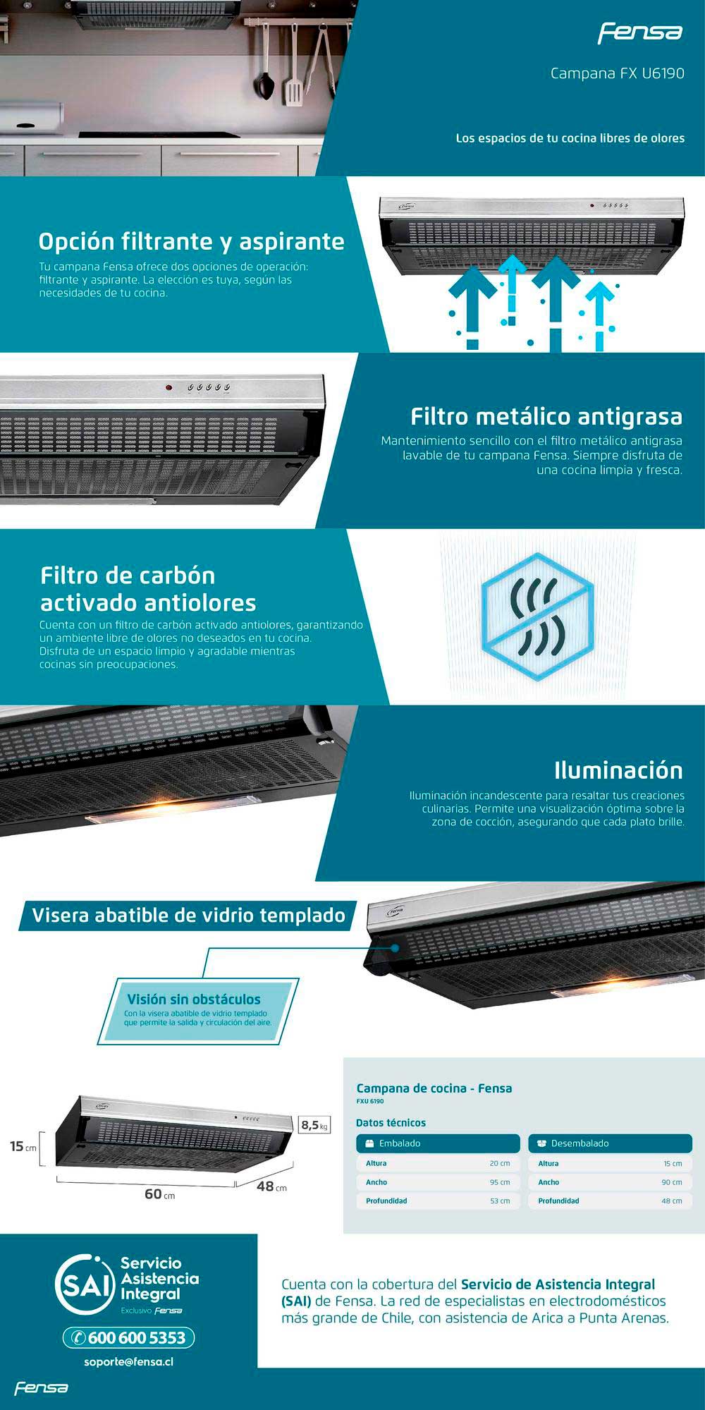 Filtro metálico antigrasa y filtro de carbón activado antiolores.