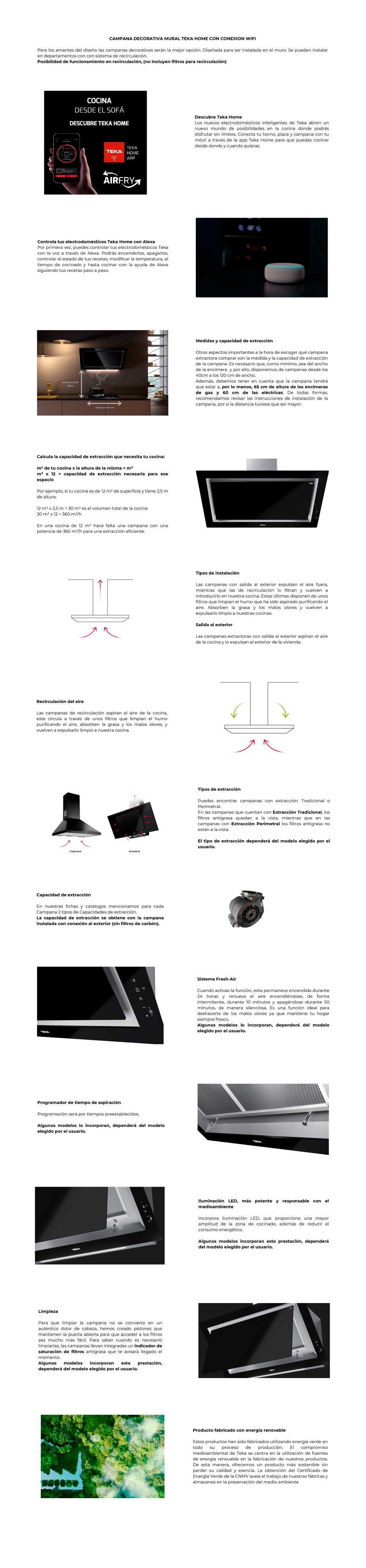 Conexión a wifi con aplicación Teka app, Piloto indicativo de funcionamientos, Posibilidad de funcionamiento en recirculación, Kits y Filtros, para recirculación: No incluidos, Motor doble turbina