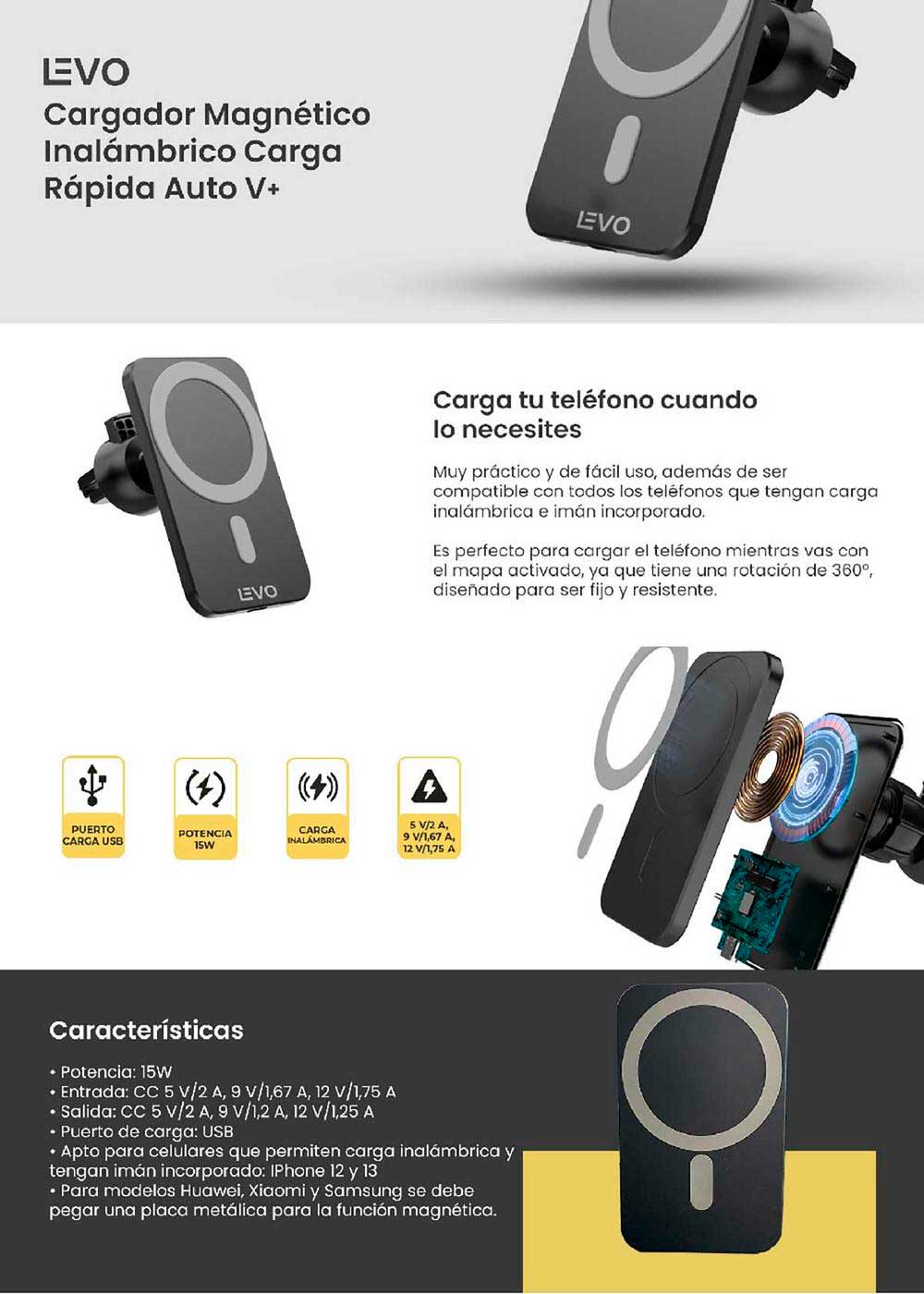 Apto para celulares que permiten carga inalámbrica y tengan imán incorporado. iPhone12 y 13 | Para modelos Huawei, Xiaomi y Samsung se debe considerar pegar una placa metálica en la carcasa para cumplir con la función magnética.