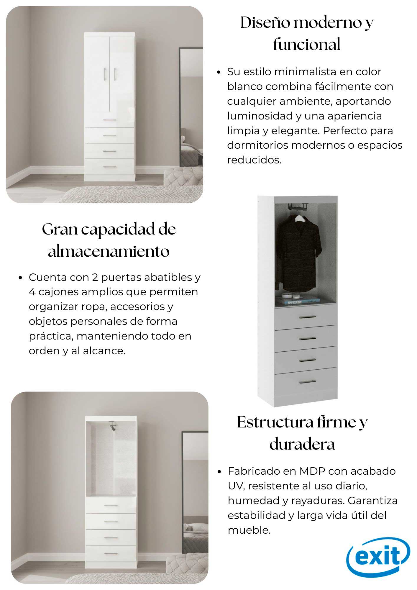 Clóset funcional y moderno con 2 puertas abatibles y 4 cajones, ideal para mantener tu dormitorio ordenado con estilo. Fabricado en MDP con acabado UV blanco, ofrece resistencia, durabilidad y fácil limpieza. Perfecto para organizar ropa y accesorios en espacios medianos.