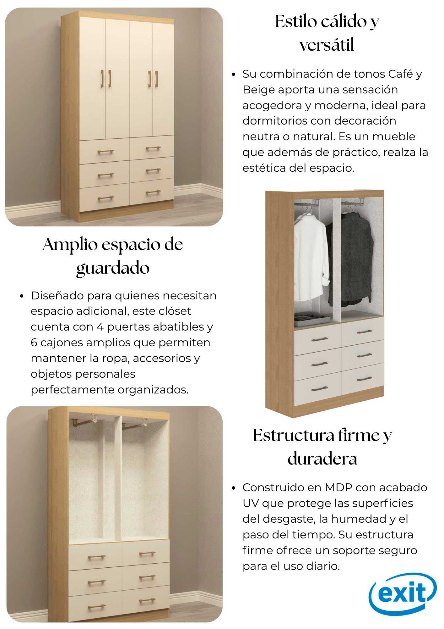Clóset funcional y moderno con 4 puertas abatibles y 6 cajones, ideal para mantener tu dormitorio ordenado con estilo. Fabricado en MDP con acabado UV en tonos Café/Beige, ofrece resistencia, durabilidad y fácil limpieza. Perfecto para organizar ropa y accesorios con elegancia.