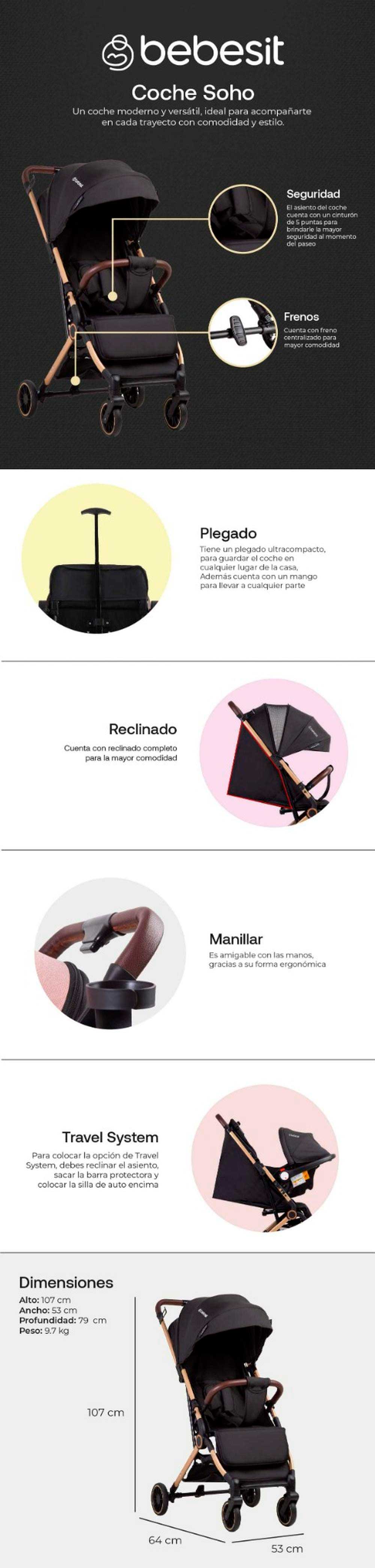 Coche travel system ultra compacto, facil plegado para transportar, cuenta con silla de auto de recien nacido a 1 año, coche paseo con multiples reclinaciones