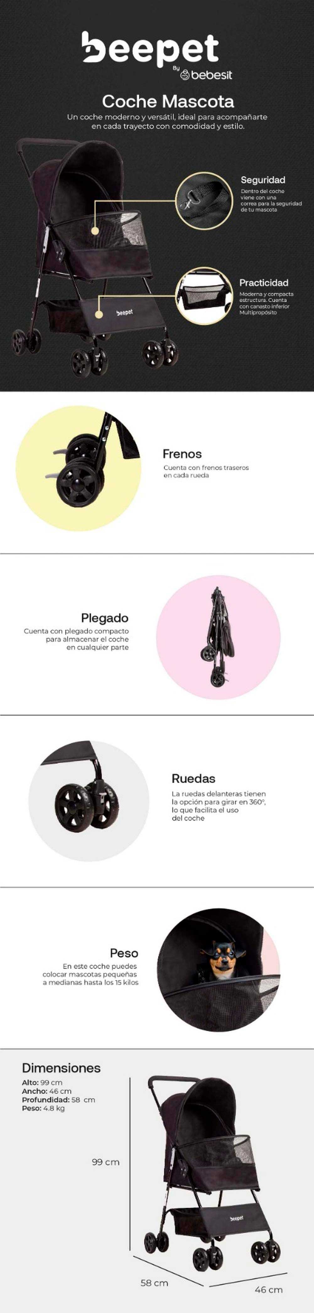 El coche para mascotas es un accesorio diseñado para transportar a su perro o gato de manera segura y cómoda. Es ideal para paseos alrededor de la casa o en el parque. Dimensiones: 46 cm de ancho x 58 cm de profundidad x 99 cm de alto, Dimensiones plegado: 67x48x23, Peso 4.8 kg, Capacidad de peso: Hasta 15 kg, 1 Correas de sujeción: Sí, para asegurar a su mascota durante el transporte,