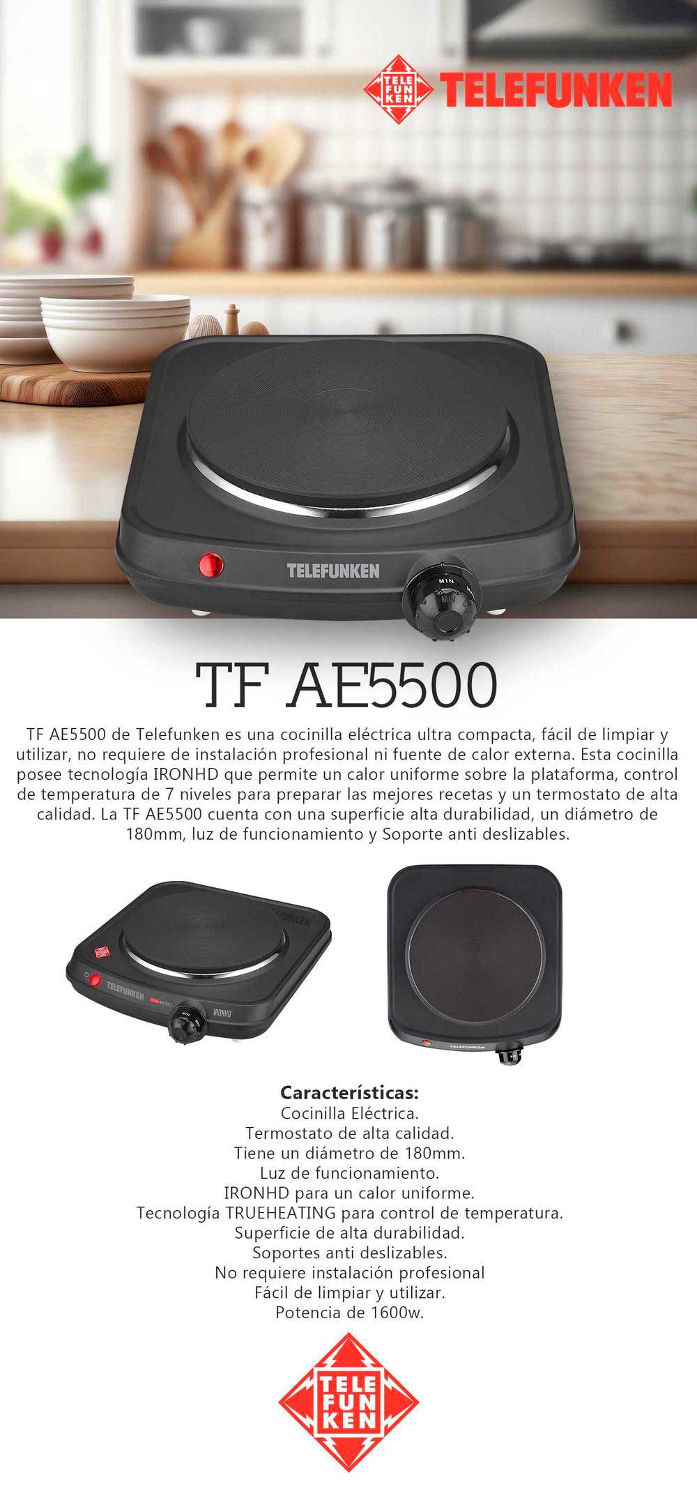 La TF-AE5500 de Telefunken es una cocinilla eléctrica que no necesita fuentes de calor externas para funcionar, como fósforos o mecheros. Cuenta con una zona calor y mando con 7 niveles de temperatura, su diámetro de es 180mm, posee luz de funcionamiento y no requiere de instalación profesional