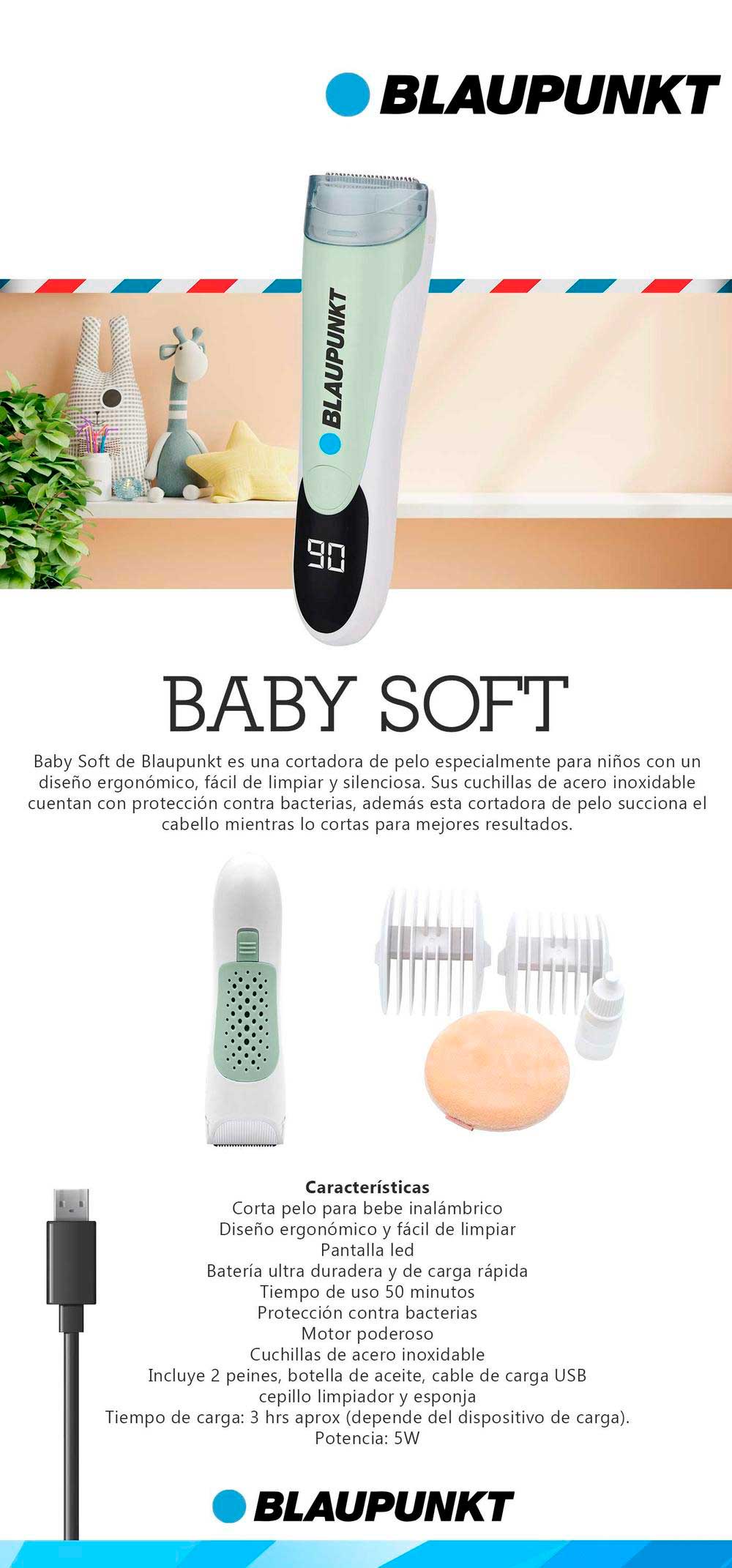 La Baby Soft de Blaupunkt es una cortadora de pelo diseñada especialmente para niños, silenciosa con cuchillas de acero inoxidable y diseño ergonómico, además succiona el cabello mientras lo cortas para mejores resultados, cuenta con dos peines.