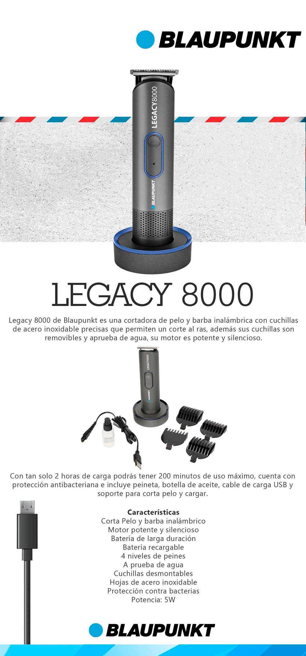 La Legacy 8000 de Blaupunkt es una cortadora de pelo y barba inalámbrica con cuchillas de acero inoxidable precisas que permiten un corte al ras, además sus cuchillas son removibles y aprueba de agua, su motor es potente y silencioso, con tan solo 2 horas de carga podrás tener 200 minutos de uso máximo, cuenta con protección antibacteriana.