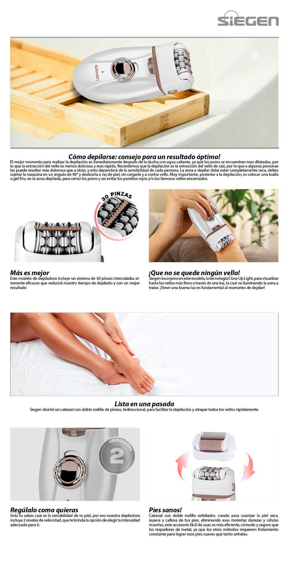 Dale a tu rutina de belleza el plus que necesita con la depiladora Siegen. Te quita el vello más rápido y de manera eficaz, por lo que no tendrás que repetir la sesión a los pocos días. Para facilitar su uso y llevarla a donde quieras, esta depiladora eléctrica funciona enchufándose a una corriente o por medio de recarga; aprovecharás su batería por varias horas para que termines tu rutina sin interrupciones. Para mejorar su desempeño, este artículo tiene 2 niveles de velocidad y está conformada por 30 pinzas e incluye luz para mayor visibilidad del área a tratar