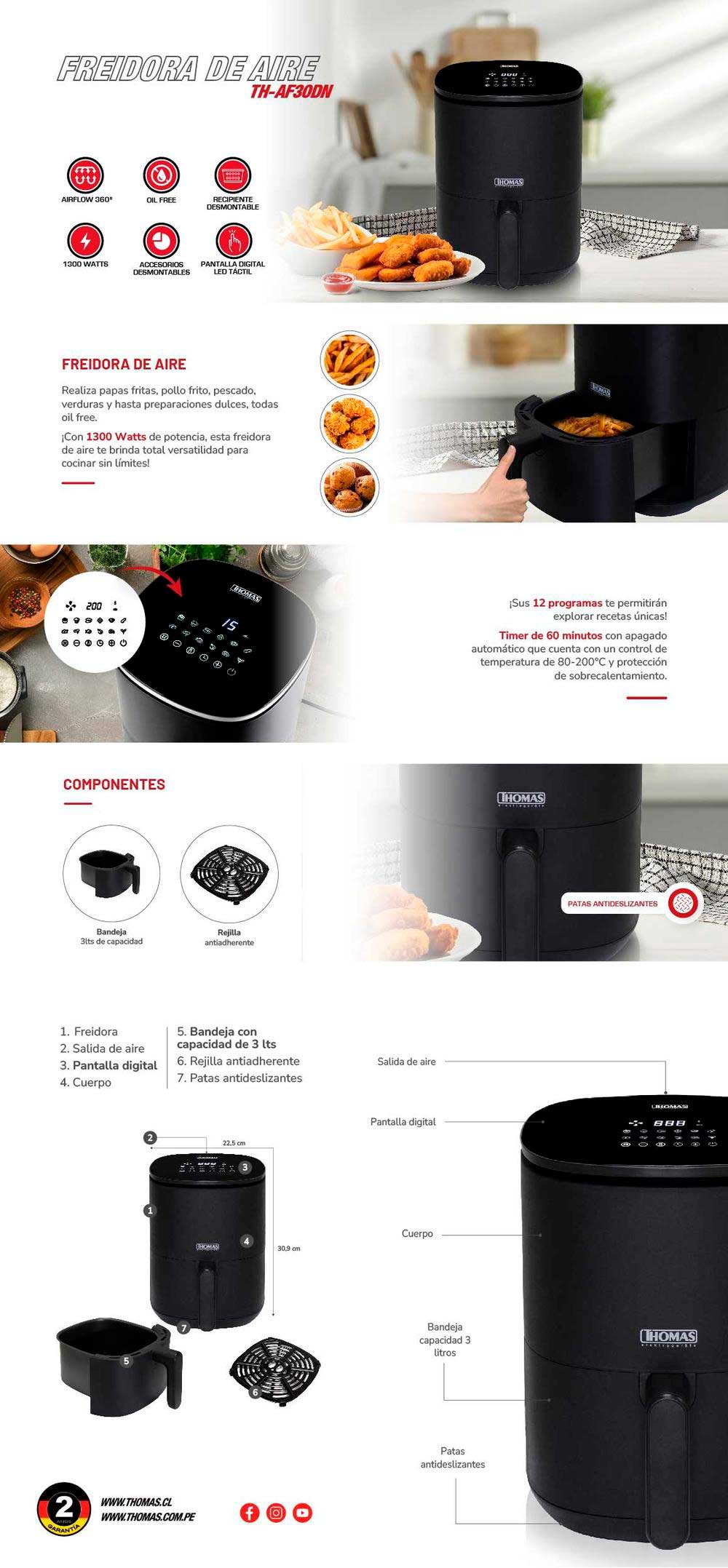 La Freidora de aire de 1300 Watts de potencia con pantalla digital y recipiente desmontable de 3lts te ofrece total comodidad para preparar tus platos favoritos facilmente