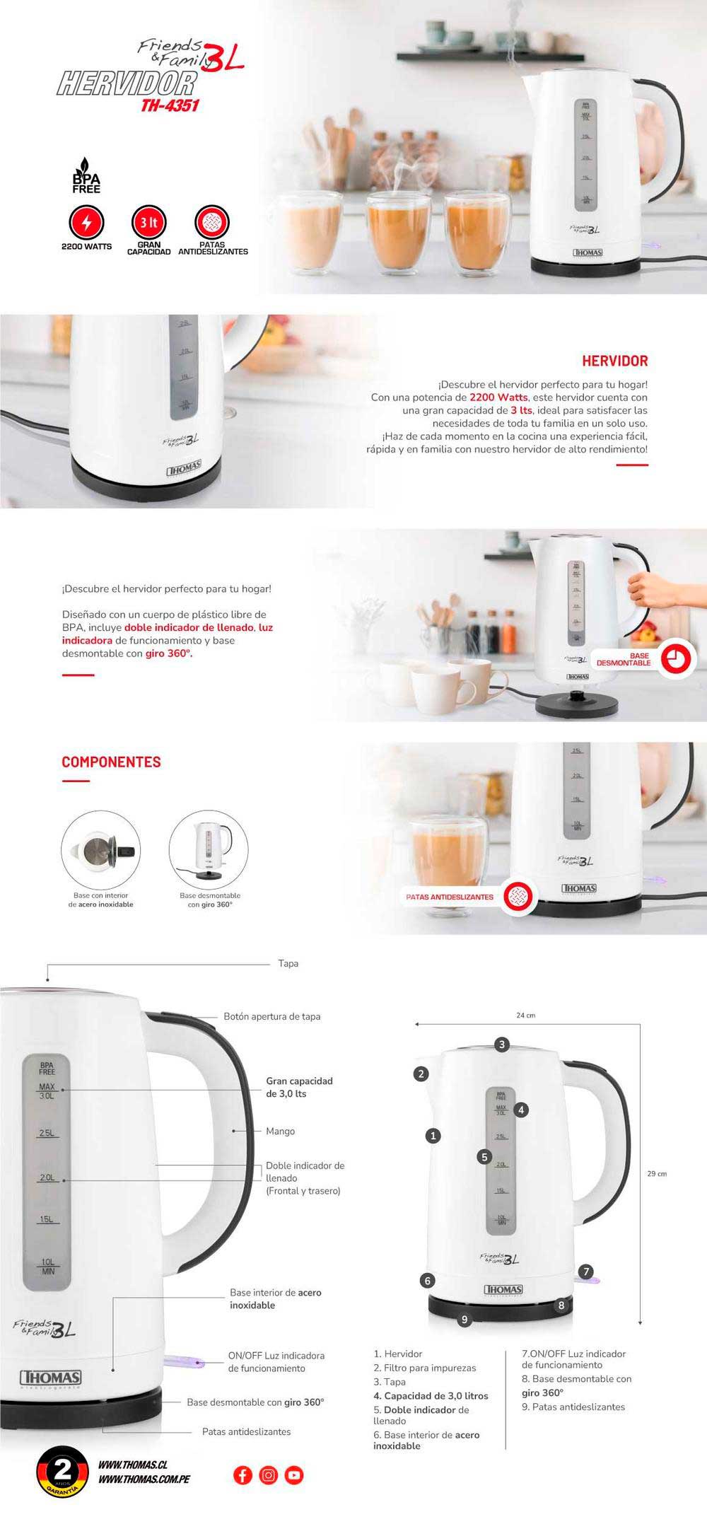 Con una potencia de 2200 watts, este hervidor y su gran capacidad de 3 litros te permite compartir momentos especiales con toda la familia, incluye doble indicador de llenado, filtro para impurezas y una base desmontable con giro 360°. ¡Equilibrio perfecto entre comodidad y rendimiento para tu cocina!