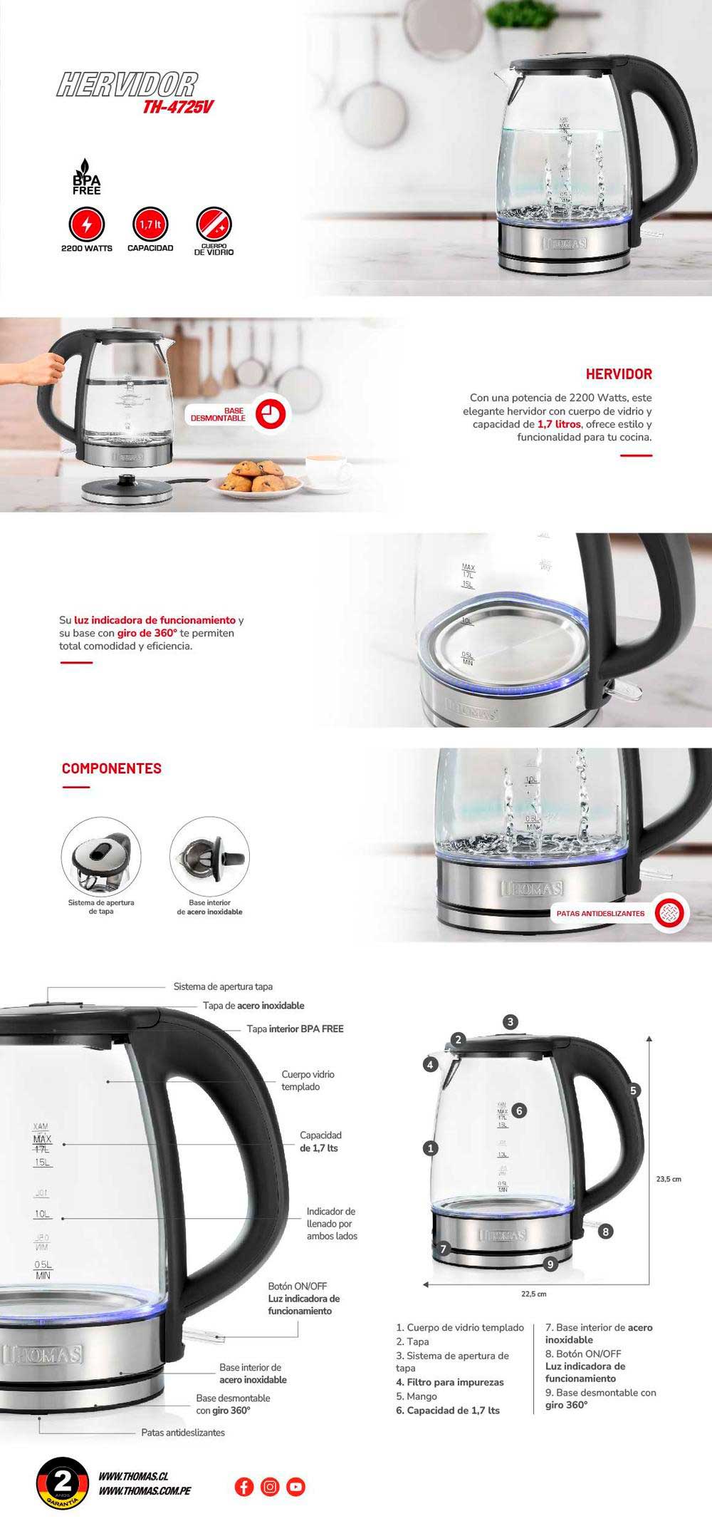 Con una potencia de 2200 watts, este elegante hervidor con cuerpo de vidrio y capacidad de 1,7 litros, ofrece estilo y funcionalidad para tu cocina. Su luz indicadora de funcionamiento y su base con giro de 360° te permiten total comodidad y eficiencia.