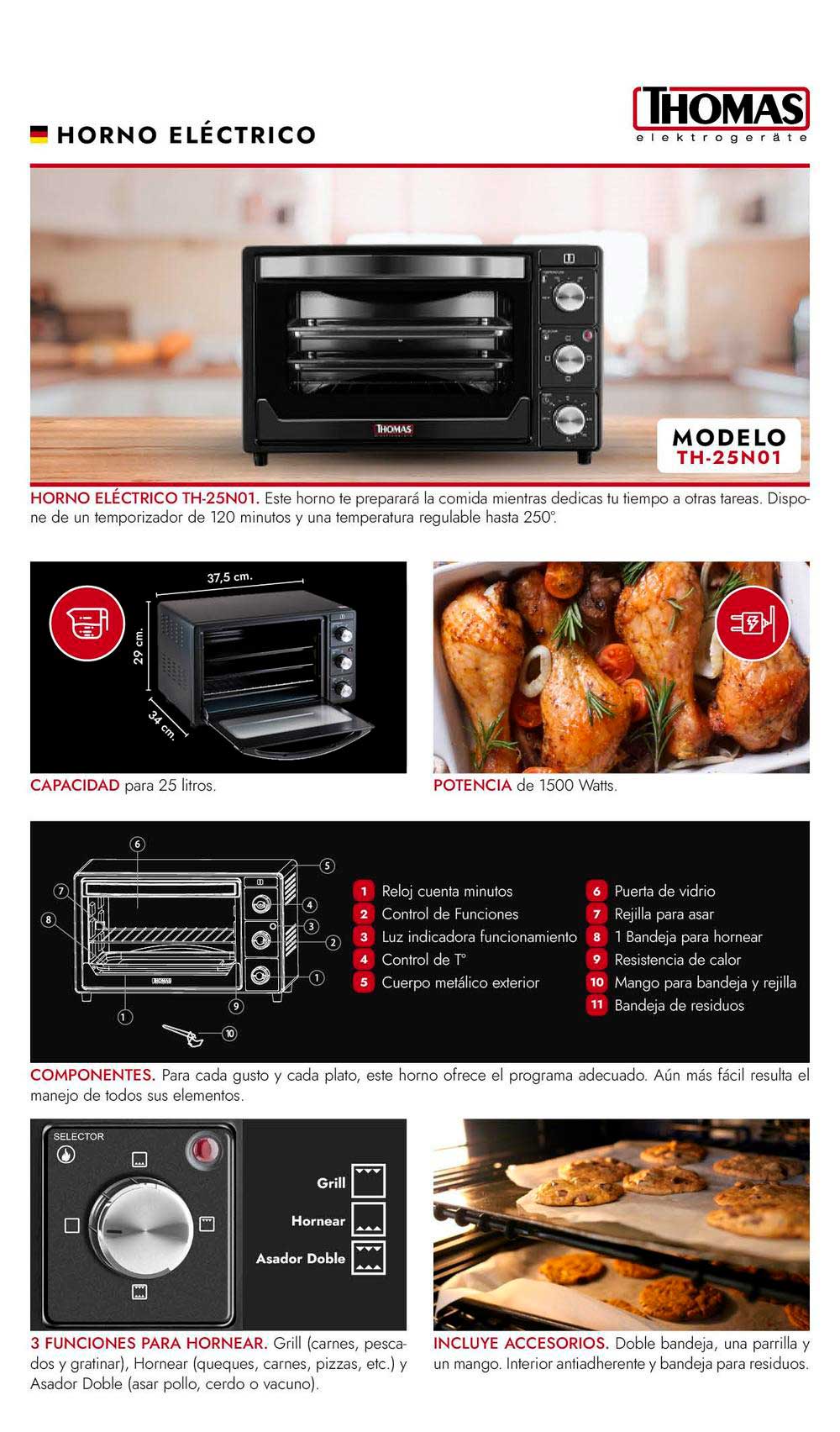 Ya no te preocupes por que tus alimentos queden crudos. El horno eléctrico Thomas de 25 L tiene una potencia de 1500 W para garantizar la correcta cocción de cada parte. Además, alcanza una temperatura máxima de 250° C, permitiendo asar todo tipo de carnes y preparar platillos gratinados. Para facilitar el ajuste de sus funciones, viene integrado por un panel análogo; este incluye un Timer de 60 minutos y la función Selector para definir de qué rendija quieres que salga más calor (inferior, superior o costados). En cuanto al tamaño, sus medidas son de 31 x 48 x 36 cm, siendo un horno eléctrico pequeño perfecto para todo tipo de cocina.