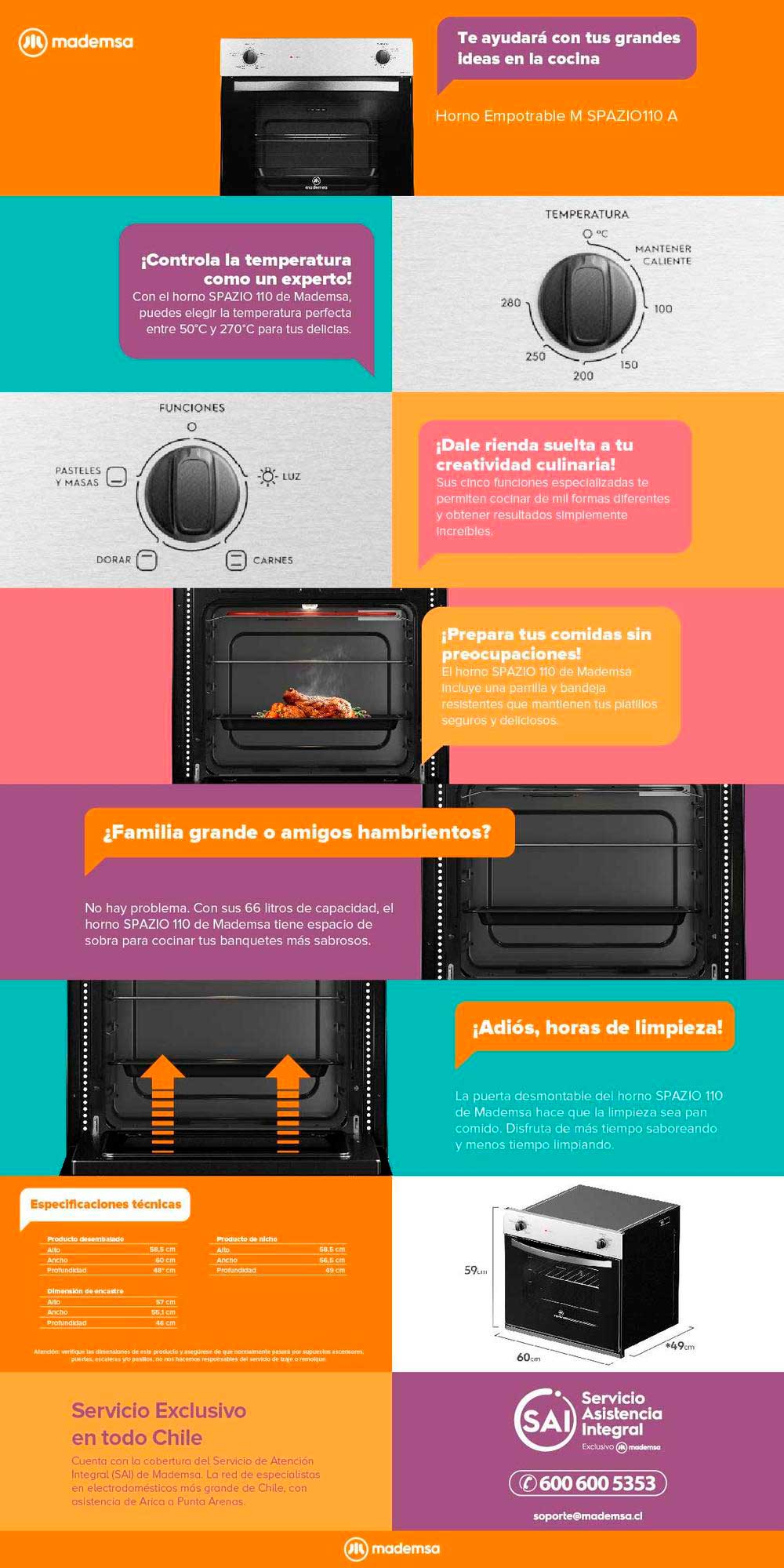 El horno M SPAZIO 110A, tiene una gran capacidad con 66 Lt, además de tener una cavidad esmaltada lo cual lo hace fácil de limpiar y doble vidrio lo cual permita ahorras energía y mantener la temperatura de puerta mas baja.