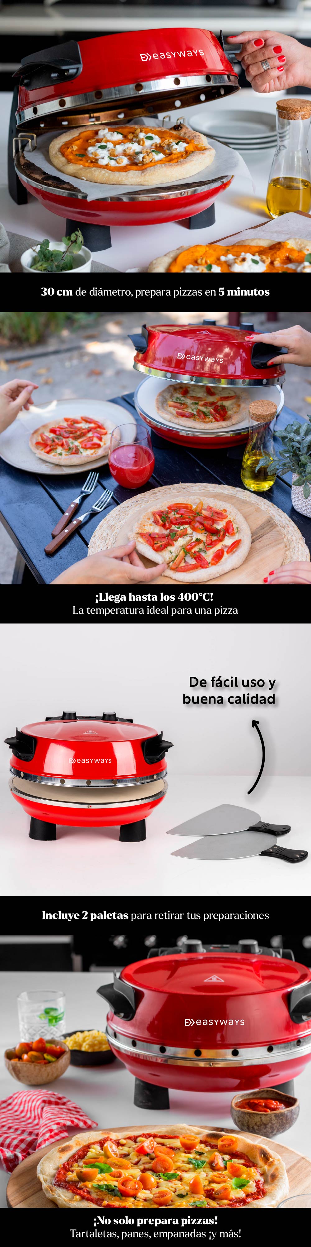 ¡Prepara la auténtica pizza a la piedra de la bella Italia en menos de 5 minutos!El horno de pizza EasyWays alcanza los 400ºC para obtener en menos de 5 minutos la mejor pizza a la piedra hecha en casa. Su material de piedra refractaria hará que el calor se distribuya de manera uniforme y absorberá la humedad de las masas.En tu horno portátil puedes preparar una pizza rápida, pizza napolitana, pizza vegana, pizza vegetariana, pizza integral, pizzas congeladas o pre hechas y muchas más. Además, puedes cocinar pescado, pollo, bizcochos, masas dulces y saladas.Contamos con un recetario online, gratuito y chileno pensado específicamente para ti. Podrás encontrar más de 100 preparaciones diferentes para tu horno de pizza.La superficie de cocción de Pizza Oven es de 30 cm de diámetro, por lo que podrás preparar una pizza tamaño familiar perfectamente. Junto con esto, Pizza Oven posee dos resistencias de calor lo que hará del tiempo de preparación de tus recetas algo corto.Pizza Oven cuenta con cuatro niveles de temperatura predeterminados, siendo los 400°C el mayor de ellos. Además, incluye luz indicadora y sonido de aviso para cuando tu preparación esté lista.Pizza Oven incluye dos paletas para que sacar tu pizza no sea un problema.Pizza Oven cuenta con 1 año de garantía.
