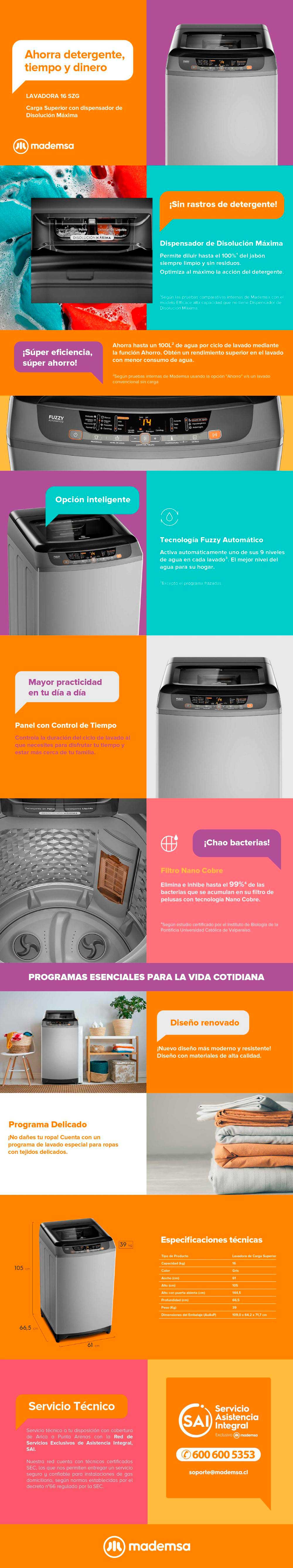 Fuzzy automático: Con esta tecnología ahorrarás en cada ciclo de lavado gracias a la medición automática del nivel de agua cuando se seleccione el programa Normal/Automático en el panel. Dispensador de disolución máxima, filtro Nano cobre, programa para frazadas, enjuague hipoalergénico y programa delicado.