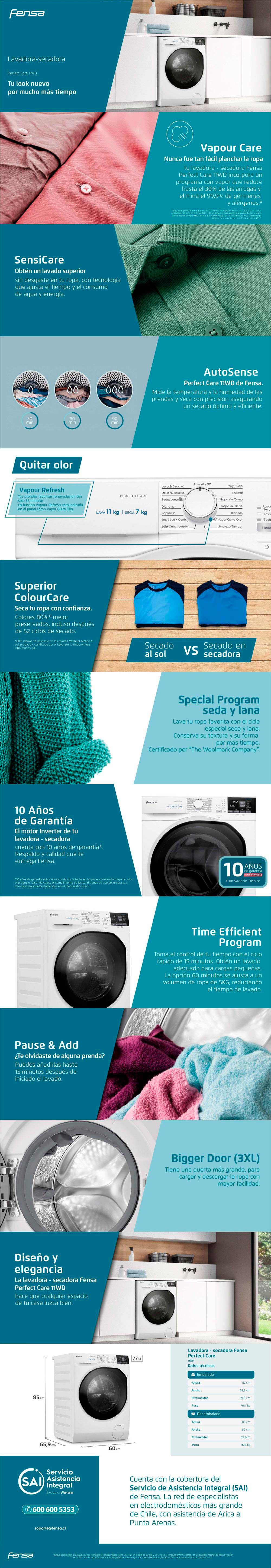 Tecnología Vapour Care que reduce arrugas en un 30% y elimina 99% de gérmenes. Tecnología SensiCare que optimiza el tiempo y consumo de agua y energía.