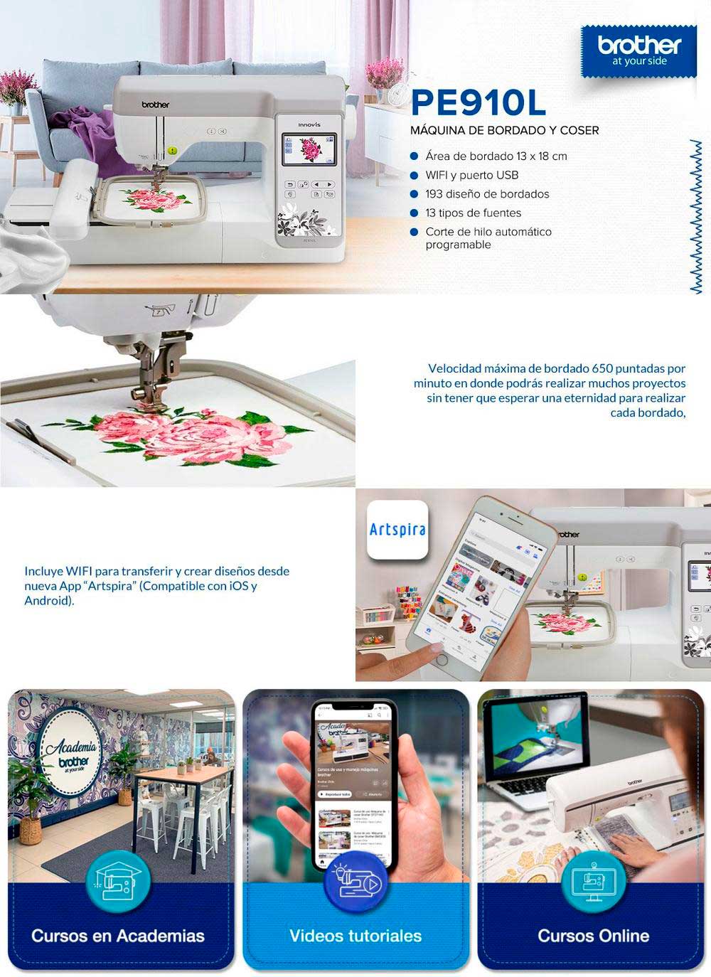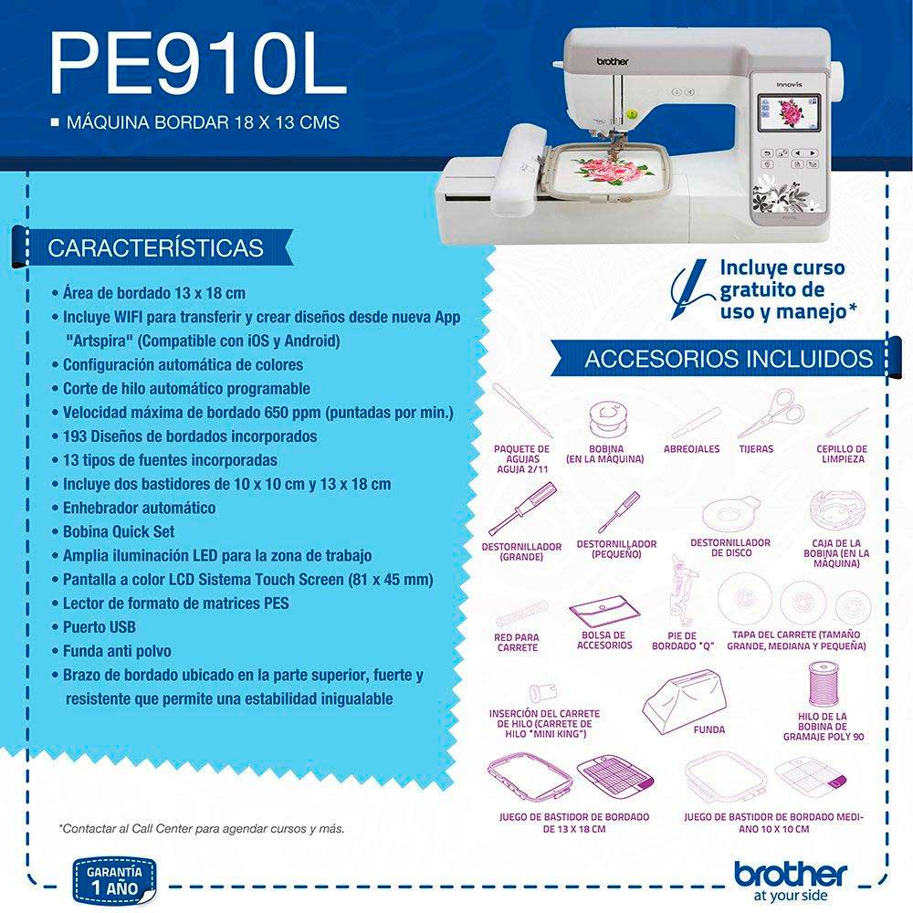 Conviértete en una costurera con la máquina bordadora PE910L de Brother, ideal para que tus creaciones queden como siempre las soñaste. Podrás hacer todo tipo de prendas, cojines, bolsos, decoración, pañuelos, disfraces, y más, debido a que cuenta con muchas funciones para realizar todo lo que la imaginación permite. Pero eso no es todo, ya que podrás incorporar tus propios diseños a través de conexion Wifi por medio de la App Artspira y entrada USB.
