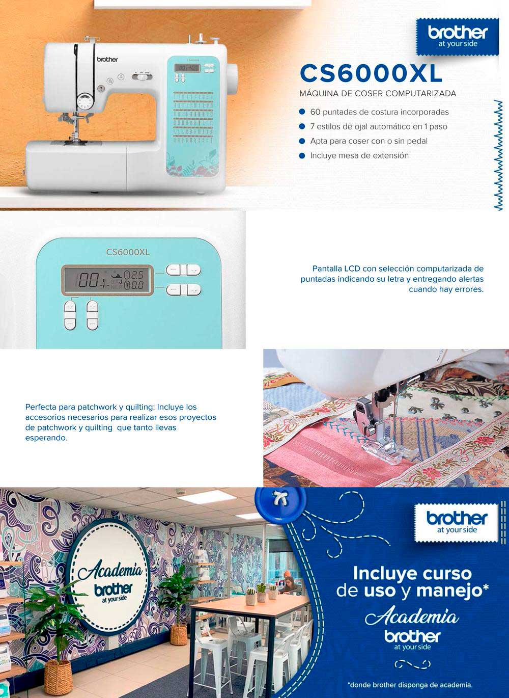 Te presentamos la nueva máquina de coser computarizada CS6000XL. Cuenta con todas las funciones que necesitas para realizar esos proyectos que tanto soñaste. La CS6000XL viene con 60 puntadas de costura incorporadas y 7 estilos de ojales automáticos de un solo paso. Perfecta para manualidades, prendas de vestir, decoraciones para el hogar o acolchados. Además, la CS6000XL incluye una amplia mesa extensible que te facilitará el trabajo en todos tus proyectos de gran tamaño.
