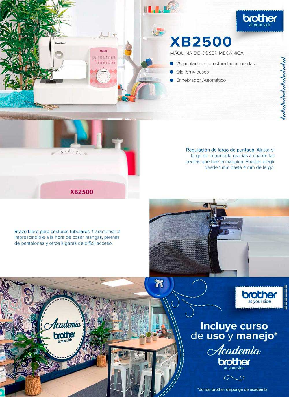 La máquina de Brother XB2500 es perfecta para aquellos que desean emprender en el mundo de las costuras. Esta máquina ofrece una variedad de 25 puntadas, tanto utilitarias como decorativas, ojal de cuatro pasos y enhebrador automático. La XB2500 es una máquina liviana que puede ser transportada a sus clases de costura. Ofrece pulsador de retroceso, control de largo de la puntada, devanador de bobina y brazo Libre para costura tubular. Con múltiples puntadas como recta, zigzag, elástica, sobrehilado, entre muchas otras, podrá realizar aplicaciones como costura para cremalleras y botones, fruncidos y zurcidos. De igual manera la XB2500 incluye algunos accesorios que facilitarán sus proyectos como es el caso del pie para cremalleras y el pie para coser botones. Con la XB2500 de Brother podrá expandir su creatividad, motivándolo a realizar incontables proyectos para su guarda ropa u hogar.