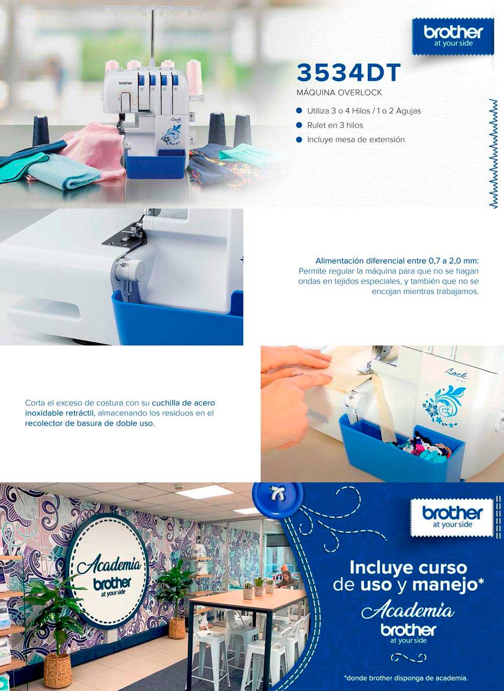 Con el modelo 3534DT le puede un aspecto profesional a su próximo proyecto. Las costuras son más planas y se ven mejor con una puntada overlock. Proyectos de decoración para el hogar a menudo sugieren el uso de una overlock para dobladillos enrollados, costuras seguras y alimentación diferencial. Elija entre 3 o 4 hilos y disfrute del nuevo y fácil método de enhebrado. La 3534DT cuenta con dos agujas y 3/4 hilos con alimentación diferencial. Cree punadas de 0.8 mm, a 4.0 mm de longitud. La relación de alimentación diferencial de 0.7 mm a 2.0 mm da una mejor calidad de puntada y el brazo libre hace más fácil coser mangas, piernas de pantalón y otros lugares difíciles de alcanzar.