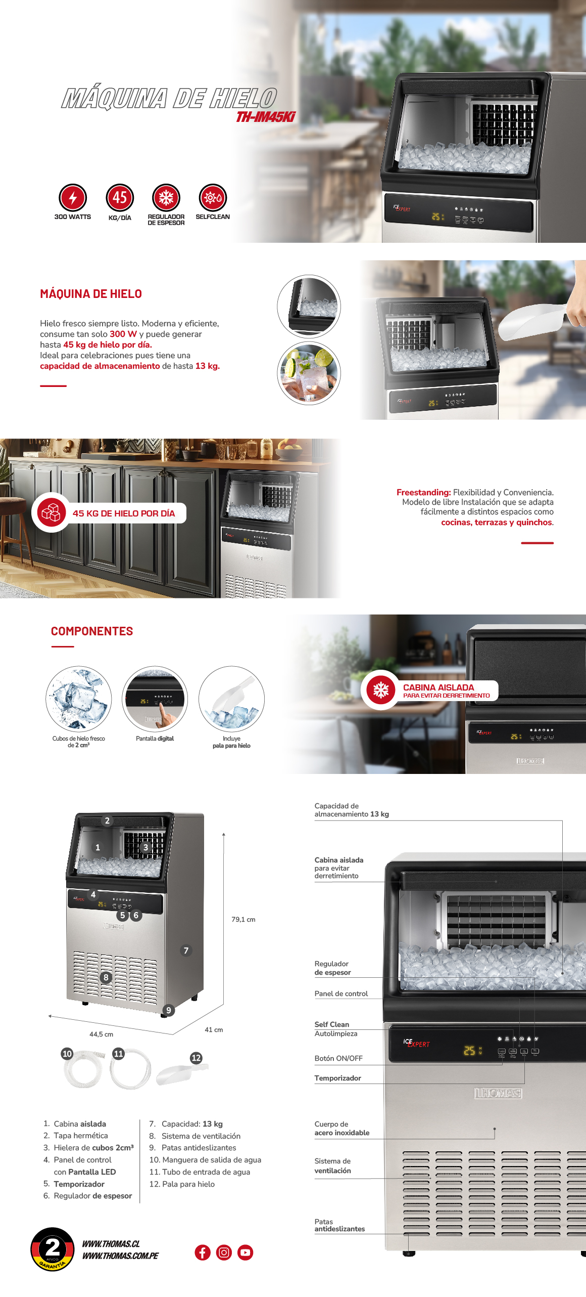 Hielo fresco siempre listo. Moderna y eficiente, consume tan solo 300W y puede generar hasta 45 Kg de hielo por día.