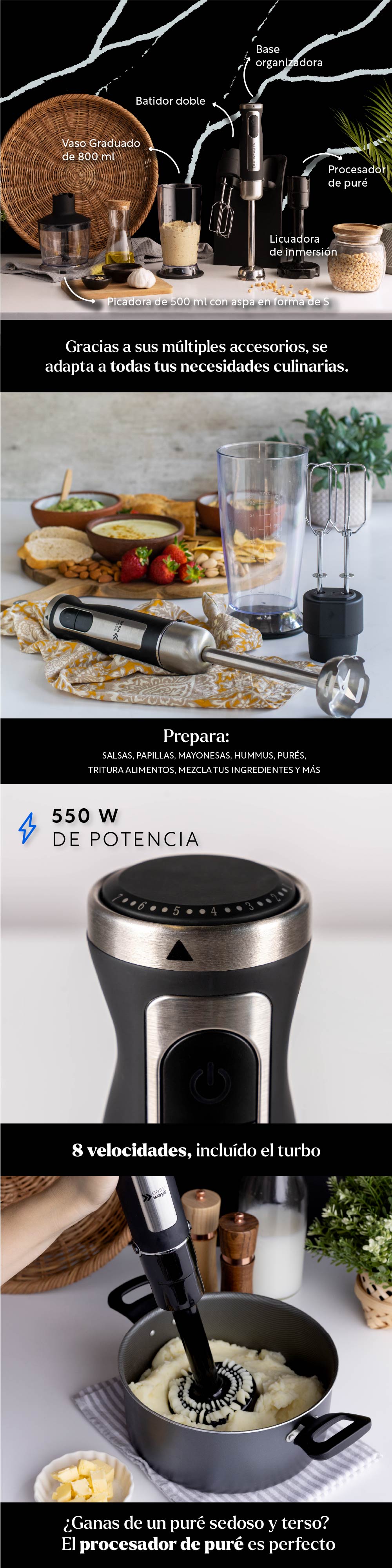 Minipimer Full de EasyWays es un equipo multifuncional, versátil y práctico, que te dará múltiples opciones para lograr todos los objetivos que estás buscando en la cocina, con resultados que te impactarán. Minipimer Full está equipada con diferentes accesorios que te permitirán reemplazar electrodomésticos y ahorrar espacio, tales como: la Licuadora de Inmersión, que es ideal para preparar salsas, sopas, mayonesas, papillas y hummus gracias a sus cuatro cuchillos de acero inoxidable que dejarán los alimentos perfectamente molidos. El Vaso graduado de 800 ml te permitirá saber exactamente la cantidad de ingredientes procesados. La Picadora de 500 ml con aspa en forma de S es especial para triturar alimentos duros, como carnes, quesos, cebolla y frutos secos. El Exclusivo Batidor Doble es perfecto para batir crema, claras de huevo y mezclar bizcochos. El Procesador de Puré es ideal para que los ingredientes logren una textura suave y sin grumos. Por último, la Base Organizadora te servirá para mantener tu cocina ordenada y perfectamente organizada. Elige la fuerza gracias a los 550 W de potencia, que te permitirán alcanzar 8 velocidades, incluido Turbo. Además, enamórate del diseño ergonómico y elegante en negro mate con detalles de acero inoxidable. Con respecto a los cuidados diarios de Minipimer Full, es muy importante limpiar la Base Principal y la Tapa de la Picadora sólo con un paño húmedo y nunca sumergirlas bajo ningún tipo de líquido. Los accesorios los puedes limpiar con detergente suave y una esponja no abrasiva. Minipimer Full cuenta con 1 año de garantía.