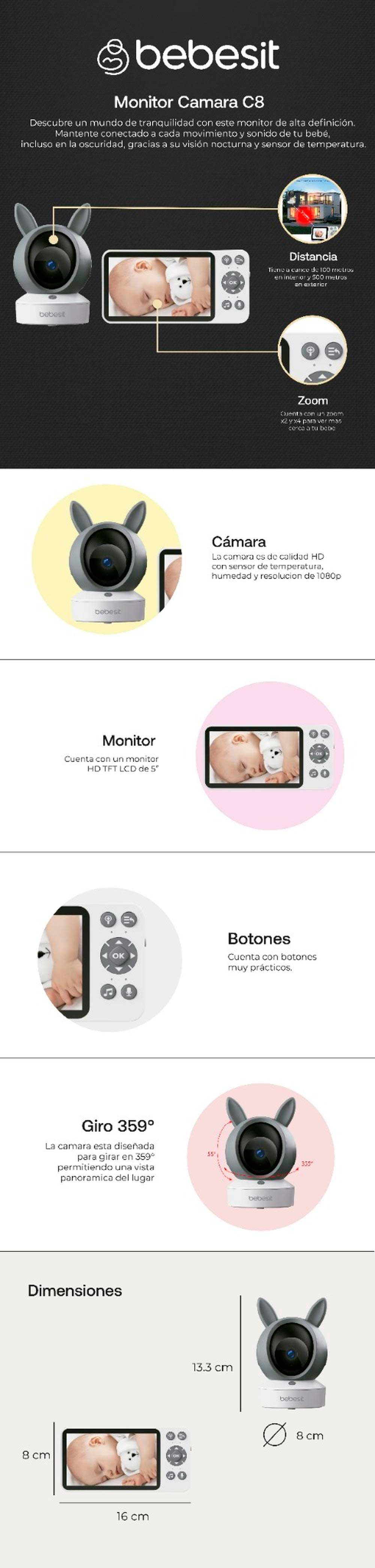 Emisor (Camara) Luz sensible a la luz: identificar el control de brillo ambiental, La luz infrarroja está encendida / apagada, Cámara: 4 capas de cámara de alta definición de vidrio completo, Micrófono: el micrófono capta el sonido para usted, Luz infrarroja: la visión nocturna complementa la luz, Botón de reinicio (R): reinicia el dispositivo, Ranuras para tarjetas tf: soporte para almacenamiento deTarjetas TF (máximo 128g), Tecla de llamada: aplicación de llamada para lograr la funciónde intercomunicación, Altavoz: toque el sonido, Sensor de temperatura: obtiene la temperatura ambiente y Humedad, Indicador de luz: la luz roja se enciende cuando la energía está encen, la luz roja parpadea cuando en emparejamiento, cuando laluz es verde, se venticon éxito.Carga tipo C: 5V/1A. Tecla de empare: transmite una señal de pareja (conectada ala pantalla LCD). Puede ajustar el ángulo de monitoreo para obtener mejores efectos visuales.Cuando el IPC está encendido, las teclas de flecha de laAPP/LCD gira la cámara horizontal y vertical para obtener mejores efectos visuales. RECEPTOR ( MONITOR) Acercar/ Alejar: Acercar o Alejar con 2X, Tecla de menú: introduzca la interfaz de menú también tiene la tecla de retorno Función, Indicador de carga: luz roja constante durante la carga; llenando Con constante de verde, Indicador de trabajo: luz azul constante después del arranque, Teclas de flecha: controle la dirección de rotación de la cámara y seleccione el submenú y subir y bajar el volumen de Control, La pantalla de Control izquierda y derecha muestra el brillo de la luz.de fondo, Clave de confirmación: aceptar la función y entrar enla pantalla para Ajustar el sonido y el brillo de la luz de fondo, Micrófono: el micrófono captura el sonido para usted, Canciones de cuna: comience o deje de tocar canciones de cuna, Intercomunicador: voz intercomunic después de pulsar el botón, Tecla de encendido: pulse y mantenga pulsado el botón durante 3 segundos se encendera /apagado, pulse brevemente el boton para apagar pantalla. Carga tipo C: 5V/1A. Altavoz: toque el sonido. Botón restablecer: restablece el dispositivo.
