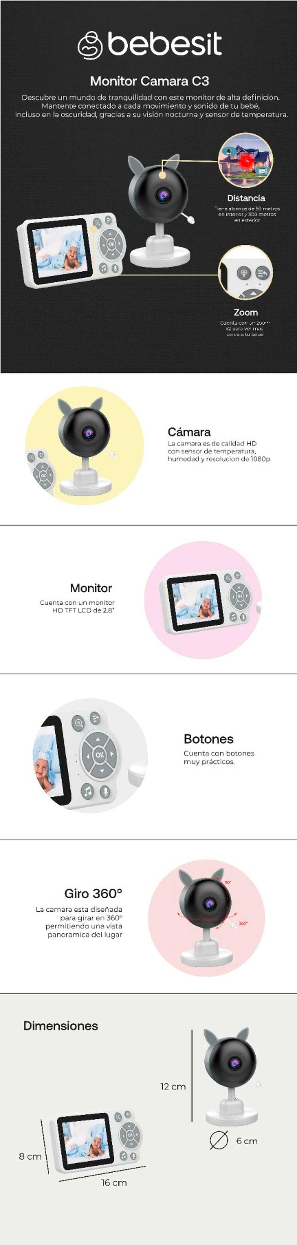 EMISOR ( CAMARA) Cámara: cámara de alta definición, Luz sensible: identificar el control de brillo ambiental de la luz infrarrojos, Luz infrarroja: luz de complemento para la visión nocturna, Indicador de trabajo: después de encender la luz Constante de la visión nocturna de la luz verde se inicia apagado automatico, Mi head: micrófono para capturar sonido para su video, Botón de emparejamiento: transmite la señal de emparejamiento, Bocina: reproducir sonido, Fuente de alimentación tipo C: 5V/1A, Sensor de temperatura: lea la temperatura en tiempo real. RECEPTOR ( MONITOR) Indicador de sonido de la cámara: indicador para mostrarel tamaño del sonido de captura de la cabeza de la cámara, Indicador de carga: carga constante de luz roja; carga completa luz verde carga constante completa, botón de zoom/zoom: amplía o reduce la imagen en 2X, tecla de menú: entrar en la interfaz del menú también tiene la misma funcion de tecla de retorno, clave de confirmación: OK función de confirmación, teclas de flecha: seleccione el menú y controle el brillo deretroiluminación de la pantalla izquierda y derecha, intercom: intercomunicación de voz después de presionar el boton, canción de cuna: iniciar o dejar de tocar la canción de cuna, mi head: micrófono para capturar el sonido para usted, indicador de trabajo: constante de luz azul después de encender, Pantalla TFT de 280 MTS de la pantalla LCD.