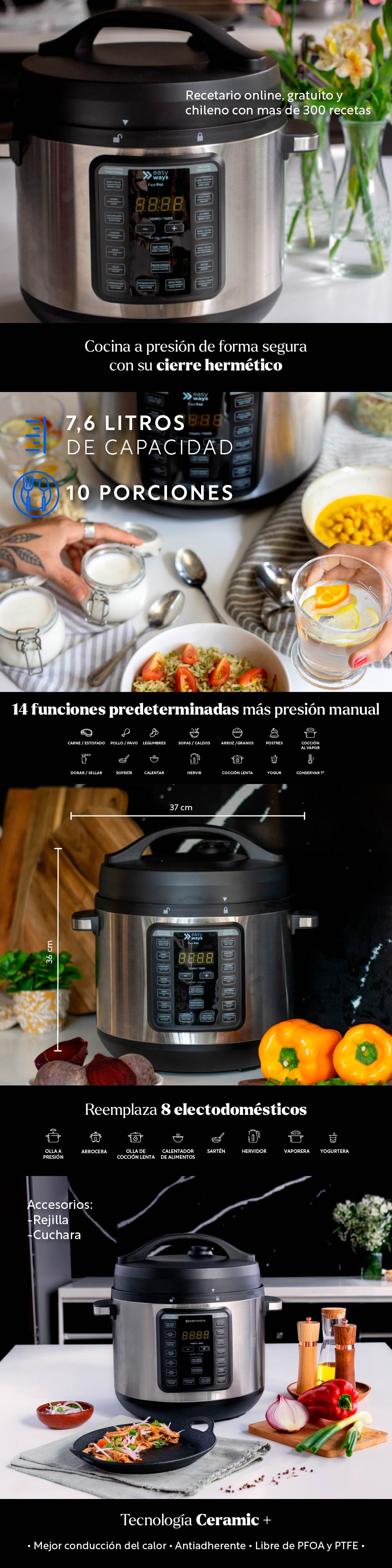 OLLA DE COCINA INTELIGENTE 15 EN 1 ¡Fast Pot te permitirá cocinar cómo quieras, cuándo quieras y para cuántos quieras! Tú eliges si prefieres hacerlo a una velocidad asombrosa con la Cocción a Presión, de la manera común con la Cocción Tradicional o tomarte el tiempo para esperar una sabrosa e inigualable Cocción Lenta. Sus 15 funciones predeterminadas te permitirán cocinar desde carnes, legumbres y granos, a sopas, yogures y postres, con sólo apretar un botón. Y para que siempre disfrutes de una comida recién hecha, puedes programar el comienzo de la cocción en hasta 4 horas más. Funciones predeterminadas: Cocción Lenta Cocción Tradicional 1. Dorar / Sellar 2. Sofreír 3. Fuego Bajo 4. Hervir Cocción a Presión 1. Carne / Estofado 2. Pollo / Pavo 3. Legumbres 4. Sopas / Caldos 5. Arroz / Granos 6. Postres 7. Cocción al Vapor Otras 1. Yogur 2. Conservar Temperatura 3. Presión Manual Fast Pot cuenta con 7,6 litros de capacidad. Con ellos podrás preparar hasta 10 porciones. La olla interior de Fast Pot tiene tecnología Ceramic +. Este es un recubrimiento de cerámica y antiadherente para cocinar en menos tiempo debido a la excelente conducción de calor. Junto con esto, este recubrimiento permite cocinar de manera segura y saludable ya que es libre de PFOA y PTFE. Fast Pot cuenta con un recetario online, gratuito y chileno con más de 320 recetas de todo tipo. Este recetario se actualiza todas las semanas con nuevas preparaciones, nunca te quedarás sin ideas. Esta olla a presión eléctrica trae como accesorios una Rejilla que es ideal para preparar alimentos al vapor. Fast Pot cuenta con 1 año de garantía.