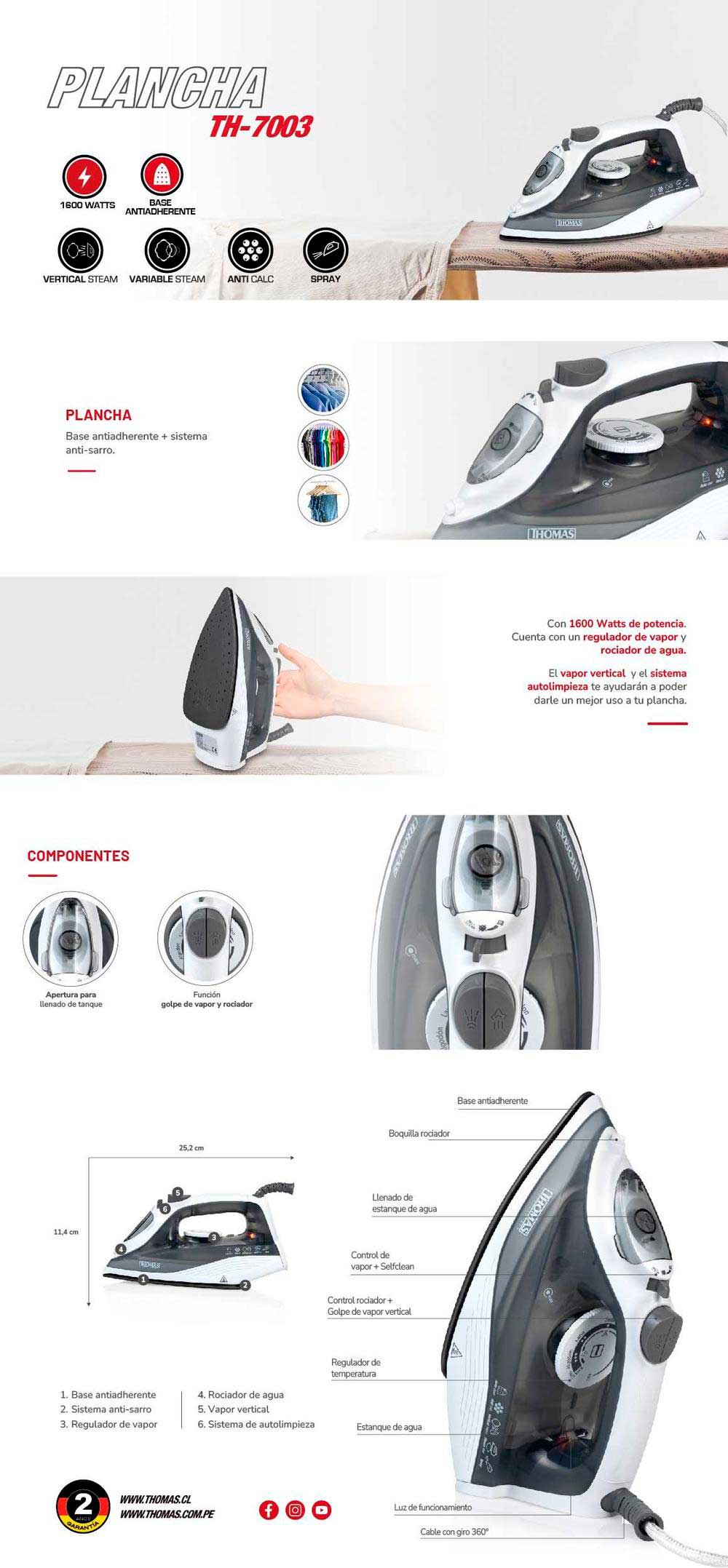 Rociador de agua + golpe de vapor, regulador de vapor + self clean, llenado tanque de agua, boquilla rociador de agua, base antiadherente, perilla reguladora de temperatura, tanque de agua, luz de funcionamiento, cable con giro 360°.
