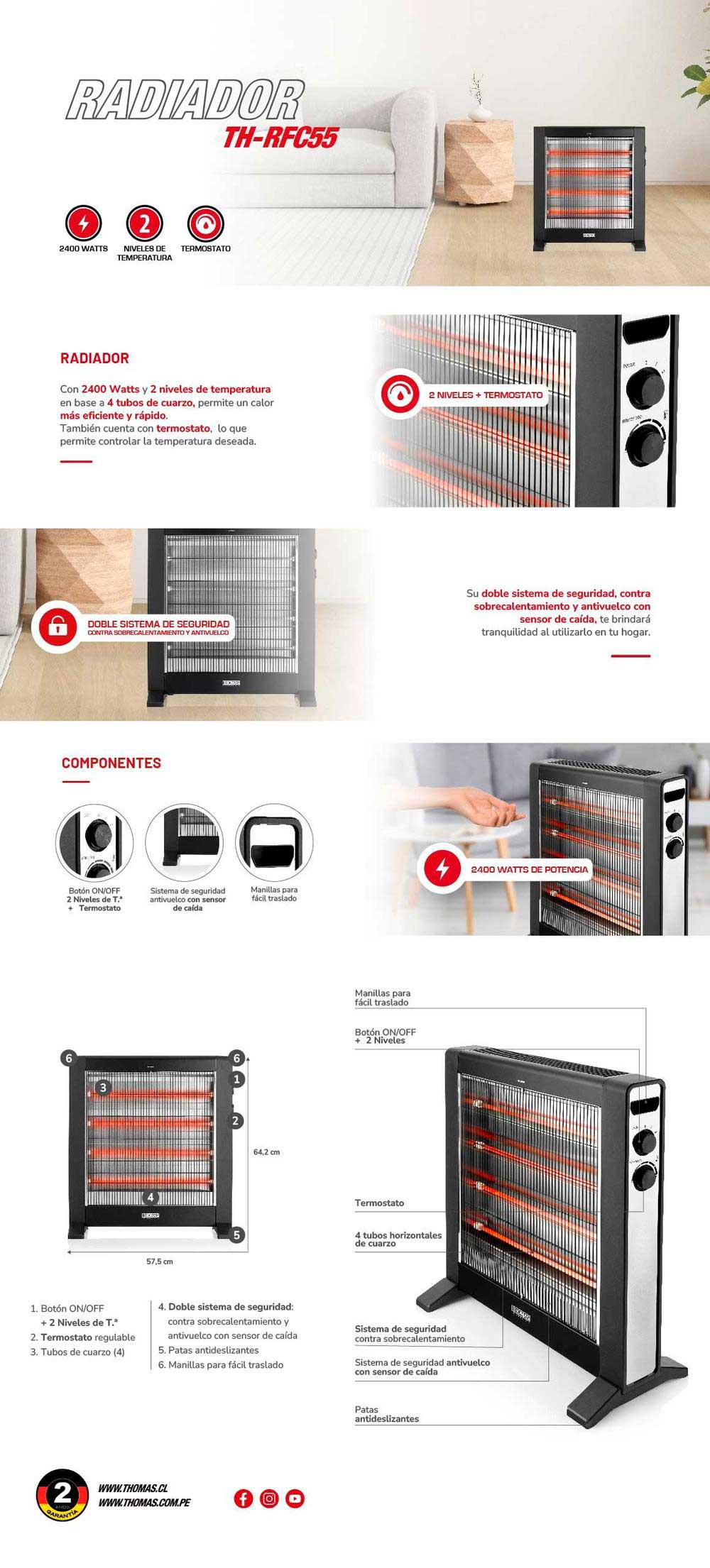 Su doble sistema de seguridad, contra recalentamiento y antivuelco con sensor de caída, te brinda tranquilidad al utilizarlo en tu hogar. 2 niveles de temperatura en base a 4 tubos de cuarzo, permite un calor más eficiente y rápido. Cuenta con termostato, lo que permite controlar la temperatura deseada