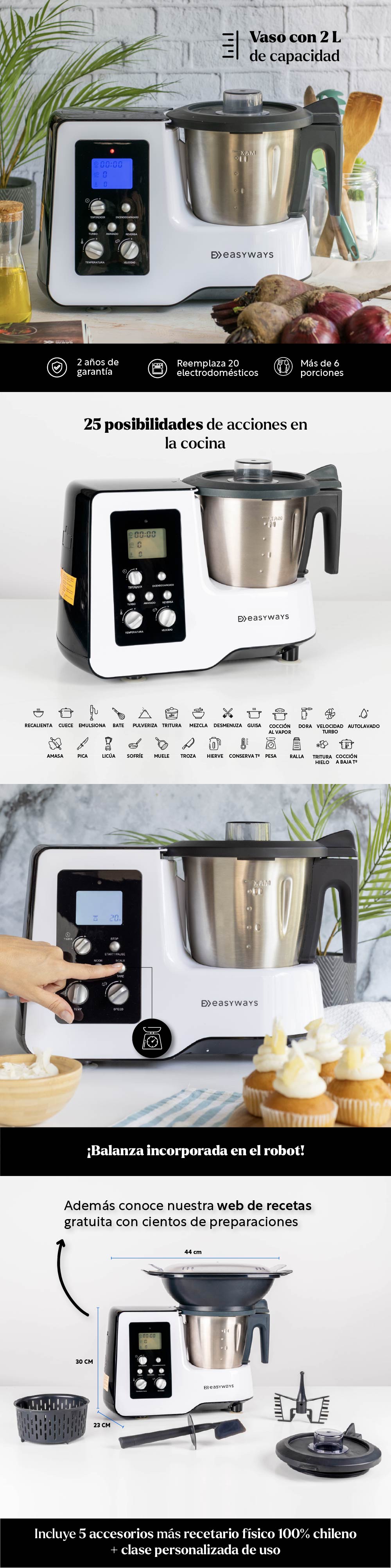 ¿Sabías que existe un Robot de Cocina que puede cocinar de todo por ti, mientras tú ocupas tu tiempo en lo que más quieres?El Robot de Cocina Kitchen Pro de EasyWays es tecnología e innovación para hacer de ti un chef sólo presionando un botón. Con él podrás reemplazar a más de 12 electrodomésticos gracias a sus más de 25 posibilidades: amasar, moler, cocción al vapor, emulsionar, pulverizar, triturar, hervir, licuar y mucho más. Kitchen Pro cuenta con un completo recetario físico con más de 300 preparaciones gourmet, caseras y creadas por chilenos. Podrás preparar platos de fondo, sopas, salsas, postres, masas, tragos, comidas para niños, mermeladas y más. Además, podrás disfrutar de cientos de recetas online y gratuitas en nuestra web.Potente motor: Kitchen Pro cuenta con una poderosa unidad de potencia de 1.800 W. Gracias a ello podrás pulverizar los granos más duros para crear harinas o picar hielo. Además, podrás llegar a altas temperaturas y lograr cocciones de manera fácil.Con Kitchen Pro podrás disfrutar de la función de Amasado Perfecto en donde el Robot dejará tus masas como si las hubiera hecho un panadero profesional. Por otro lado, podrás jugar con sus diferentes opciones de temperatura ya que llega hasta los 105°C. Gracias al aspa de Kitchen Pro podrás cortar y mezclar, dependiendo del movimiento del giro, lo que te permitirá evitar gastar esfuerzos innecesarios. El Vaso de Kitchen Pro cuenta con 2 litros de capacidad por lo que podrás cocinar para hasta 6 porciones o incluso más dependiendo de lo que vayas a preparar. Además, podrás disfrutar de diferentes accesorios incluidos: Vaporera, Canastillo, Tapita de Medición, Balanza, Mezclador, Espátula y Recetario.Kitchen Pro cuenta con 2 años de garantía. Además por la compra de este Robot tendrás derecho a una Demostración gratuita presencial u online con una representante EasyWays en donde se te enseñará su usabilidad y se te darán muchos consejos para una mejor experiencia.