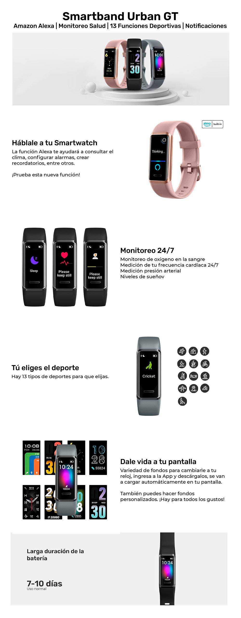 Incluye asistente de voz de Alexa | Monitoreo de frecuencia cardiaca | Monitoreo de presión | Monitoreo del sueño | Recordatorio de sedentarismo | Oxigeno en la sangre | Notificaciones de llamada | Clima | Control de la reproducción de música | 13 modos deportivos: trote interior y exterior, caminata interior y exterior, bicicleta interior y exterior, cricket, senderismo, natación, yoga, remadora, elíptica, fitness.