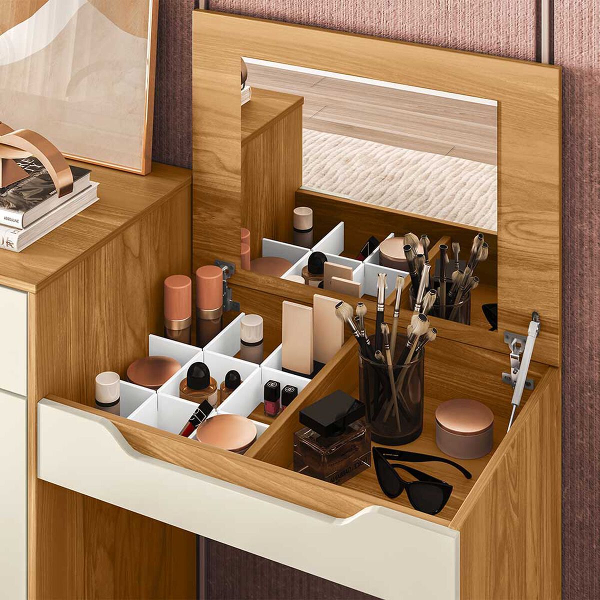 Tocador Trend fabricado en aglomerado MDP color café con 0,15 cm de espesor. Posee 2 cajones, 2 puertas y 1 espejo. De diseño simple y tamaño óptimo para espacios reducidos, tendrás el espacio perfecto para tus sesiones de maquillaje, rutinas de skincare o peinados.