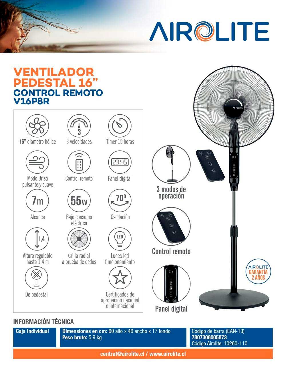 El Ventilador Pedestal V16P8R BLACK AIROLITE se ha convertido en el favorito de muchos. Con sus 40 cm de diámetro es el equipo ideal si estas buscando ventilar y dar estilo a tus espacios. Su acabado Negro brillante combina perfecto con todos tus ambientes, además incluye un panel digital LED y timer para poder programar su uso como gustes. De bajo consumo eléctrico, este producto cambiará la forma en que ventilas tu hogar. Incluye control remoto para hacer de su uso algo mucho mas practico en combinación con sus 3 modos de funcionamiento; brisa, pulsante y suave.
